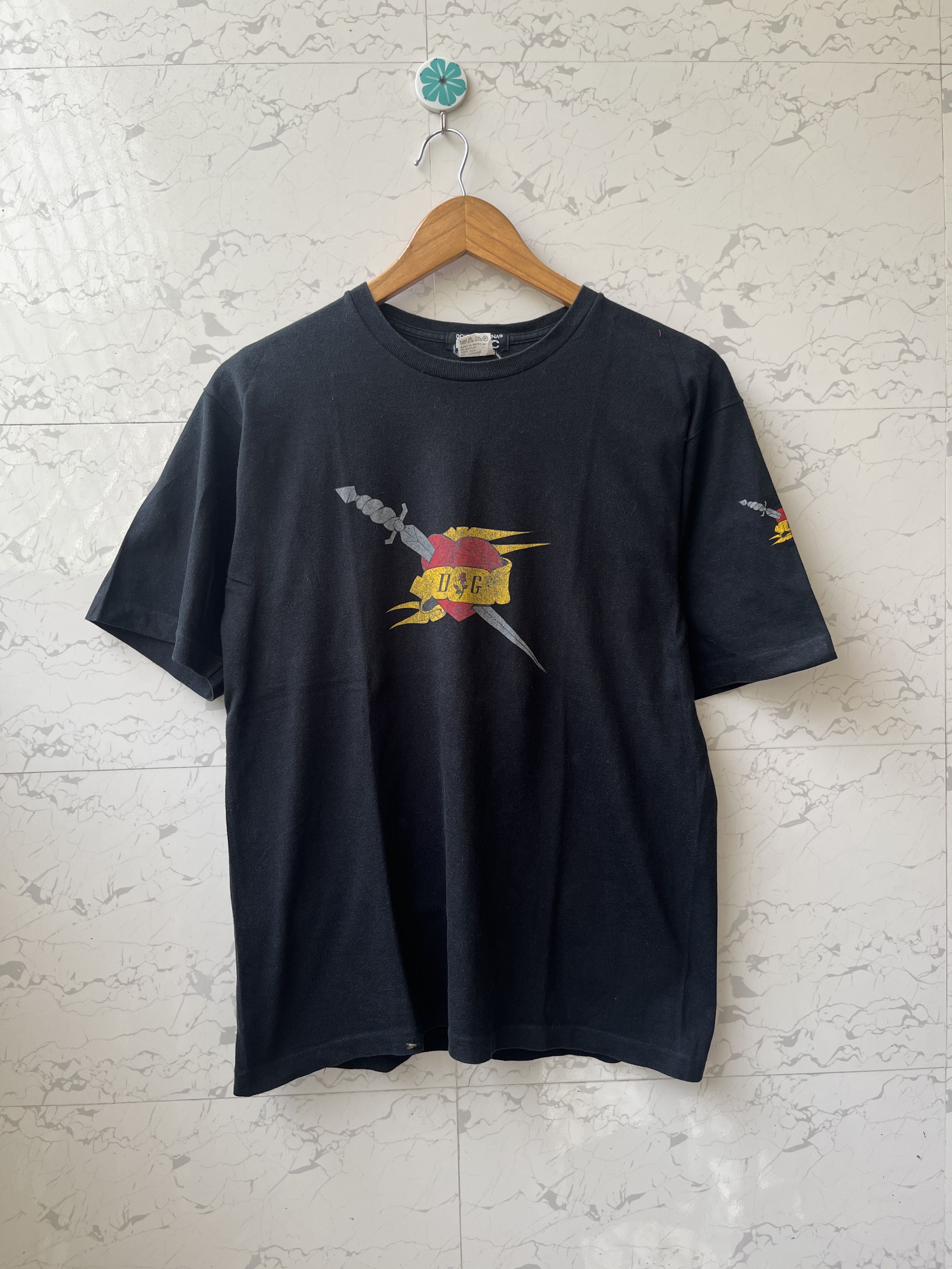 (Made in Italy) (Single stitch all over) Rare 90s-2000s era D&G tee featuring a striking front and sleeve graphic of a sword piercing a heart with flames and the “D&G” banner. A true standout from the Dolce & Gabbana BASIC line , Single stitch — made in Italy with soft 100% cotton. Boxy vintage fit with minimal fading and natural wear that adds character. Super clean with no major flaws. Great pickup for anyone into Y2K, archive designer, or rare streetwear graphics. Tag Size: M Fits Like: M (boxy vintage fit) Measurements: • Chest: 20” x2 • Length: 25” • Shoulders: 19” • Sleeves: 9” Condition: 8.5/10 — gently worn, no holes or stains Made in Italy 💸 Grab it now at the best deal before it’s too late! 📦 Fast Worldwide Shipping (5–7 days) 🚀 Ships within 24 hours – Safe & Secure Packaging 💌 DM for any queries #DolceandGabbana #vintageDolceandGabbana #2000sfashion #archive