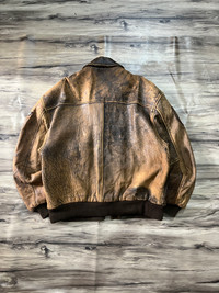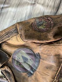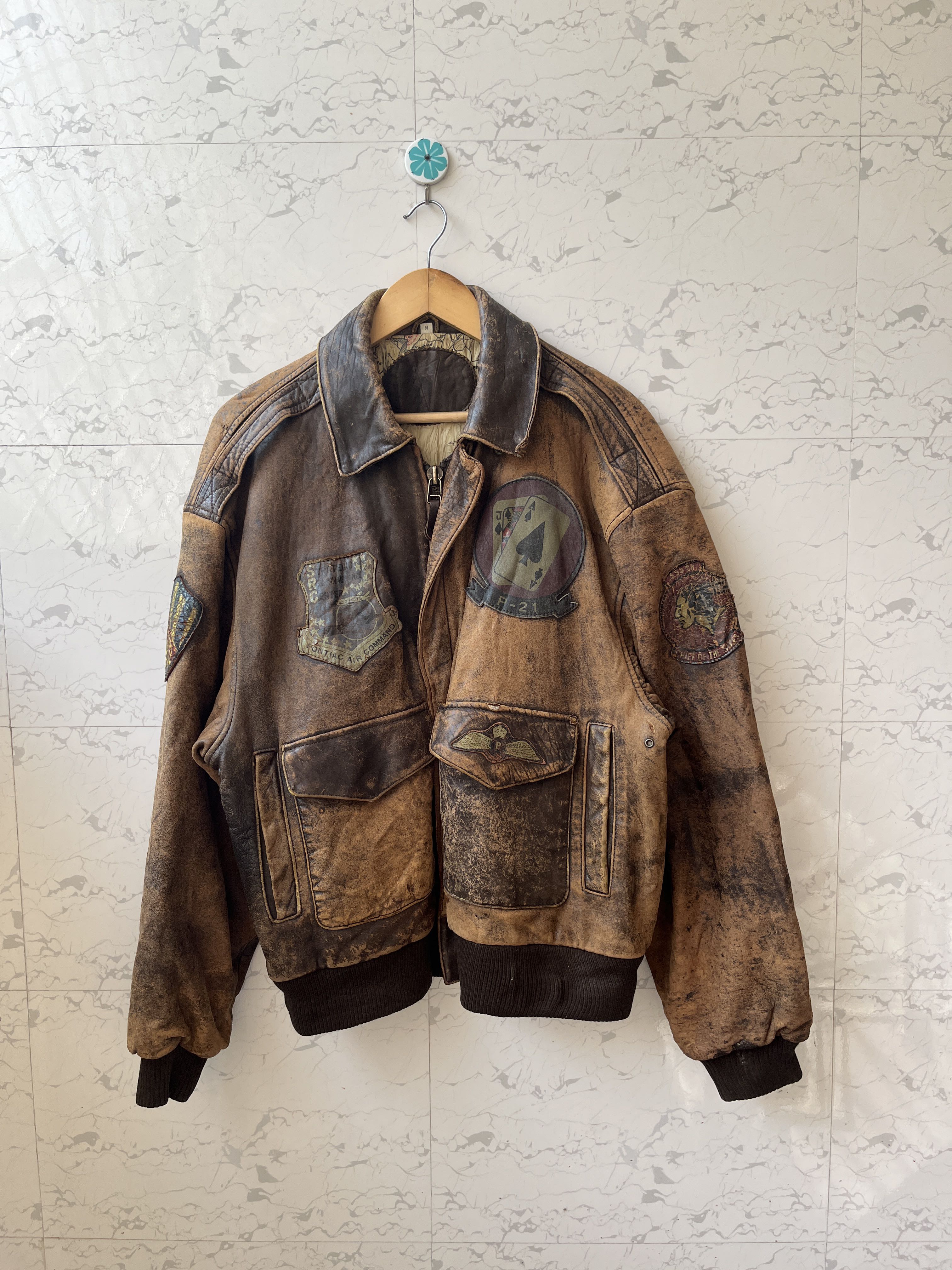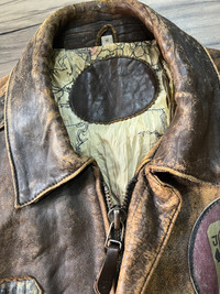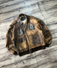 Heavily distressed A-2 bomber with military-style patches and escape map lining. Made from very soft, buttery leather with amazing patina and wear. Tagged Size: M [Refer to Measurements for best fit] Measurements (inches): Chest: 26 x2 Length: 26.5 Shoulders: 22 Sleeve: 23.5 [Vintage Boxy fit ] Few minor negligible defects shown in the last photos First come, first served. π¦ Fast Worldwide Shipping (5β7 Days) π Ships within 24 Hours π§€ Safely Packed with Care. #VintageLeather #flightjacket #avirexmilitary #avirex #avirexvarsity