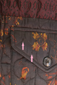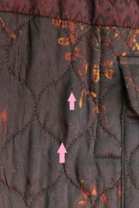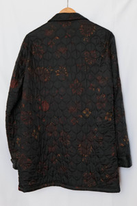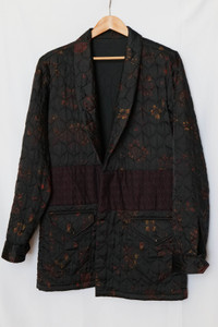 Viscose fabric, quilted and lightly padded. The jacket has been professionally modified to remove the piece that goes across the front of the waist, along with the ties that hold the jacket shut. See runway photo for comparison. The work was done well and if you didn't know what it looked like before, you wouldn't notice it. There are a few small holes near one of the front pockets. The jacket is otherwise in excellent condition. Tag size 52. Ships from Canada with UPS. @things_here1 Chest 22.05 in 56 cm Length 33.46 in 85 cm Shoulders 19.49 in 49.5 cm Sleeve Length 26.18 in 66.5 cm