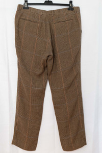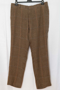 Soft linen fabric in brown, black, orange, and blue. Excellent condition. The waistband has been made smaller and could be let out again. Tagged size 54. Ships from Canada with UPS. Waist 18.31 in 46.5 cm Inseam 31.3 in 79.5 cm Leg Opening 7.87 in 20 cm Front Rise 10.43 in 26.5 cm Thigh 14.37 in 36.5 cm