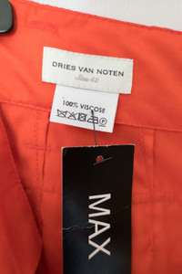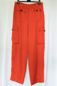 Viscose satin fabric. Relaxed and high-waisted fit with a taper at the lower leg. The color is between red and orange, called "flame" on the tag. Excellent condition. Size 42. Ships from Canada with UPS. @things_here1 Waist 17.72 in 45 cm Inseam 33.86 in 86 cm Leg Opening 9.84 in 25 cm Front Rise 13.98 in 35.5 cm Thigh 16.34 in 41.5 cm