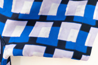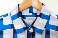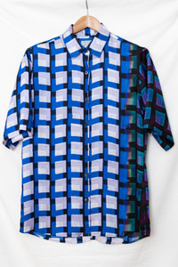Viscose satin fabric. The shirt is in excellent condition apart from a thread run and a tiny stain at the back of one sleeve (both shown in the same photo). This is a relaxed fitting women's size 40. The size and cut is like a men's Medium. Ships from Canada with UPS. Chest 21.85 in / 55.5 cm Length 30.12 in / 76.5 cm Shoulders1 8.5 in / 47 cm Sleeve Length 12.2 in / 31 cm