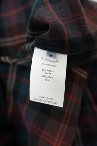 New with tags. Wool and cotton fabric. The main color is dark-bluish green. Size M. Ships from Canada with UPS. Chest 21.06 in 53.5 cm Length 30.51 in 77.5 cm Shoulders 18.9 in 48 cm Sleeve Length 26.97 in 68.5 cm