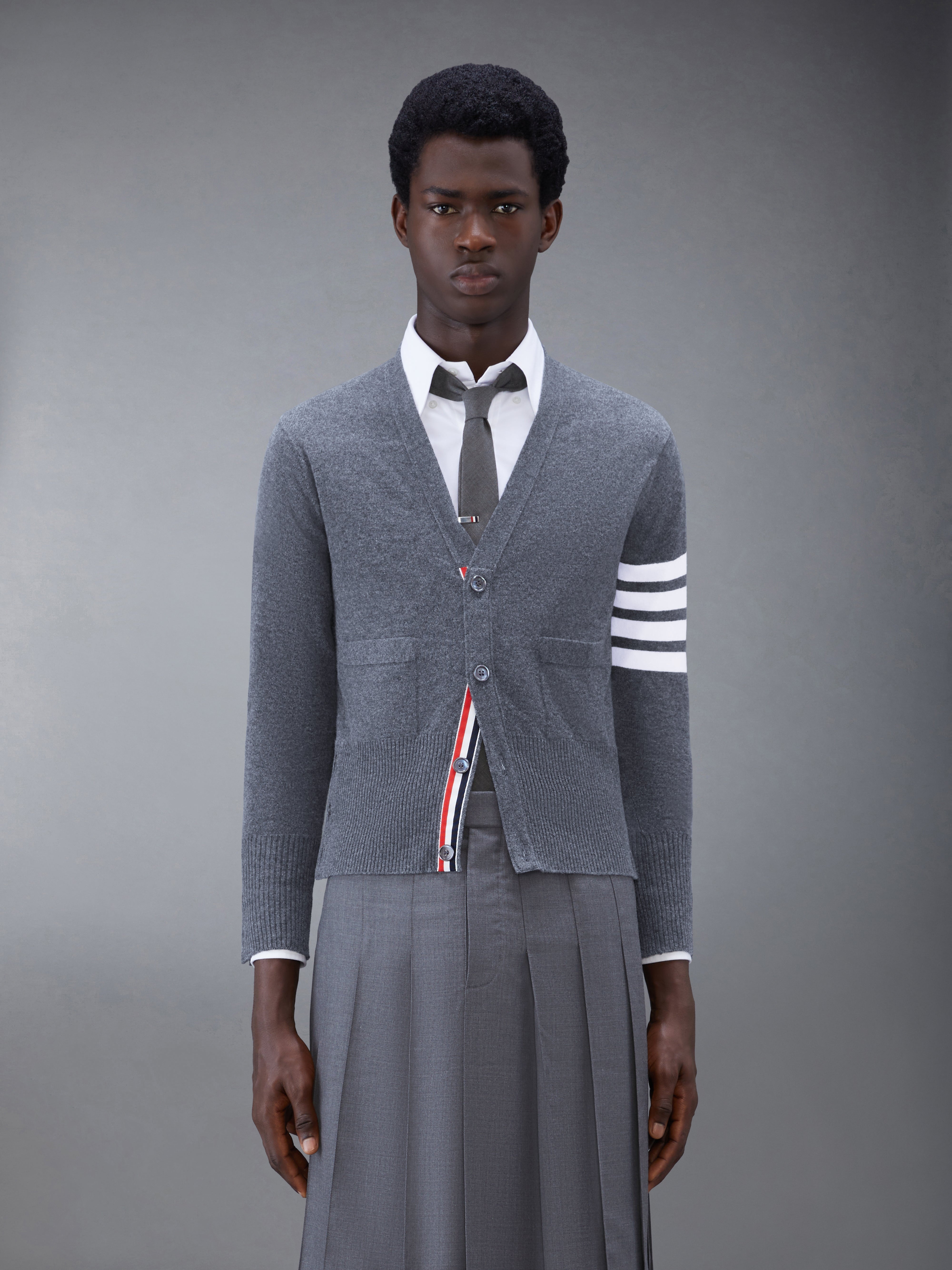 Classic V-neck cardigan in navy cashmere with engineered 4-bar stripe detail at left sleeve in white. Front button closure with signature striped placket. Ribbed cuffs and hem with buttoned vents featuring striped grosgrain trim. 2 patch front pockets. Signature striped grosgrain loop tab at back of neck. Model is 6' 1"; (185mm), wearing size 1. 100% Cashmere Made in the UK MKC001A-00011-022