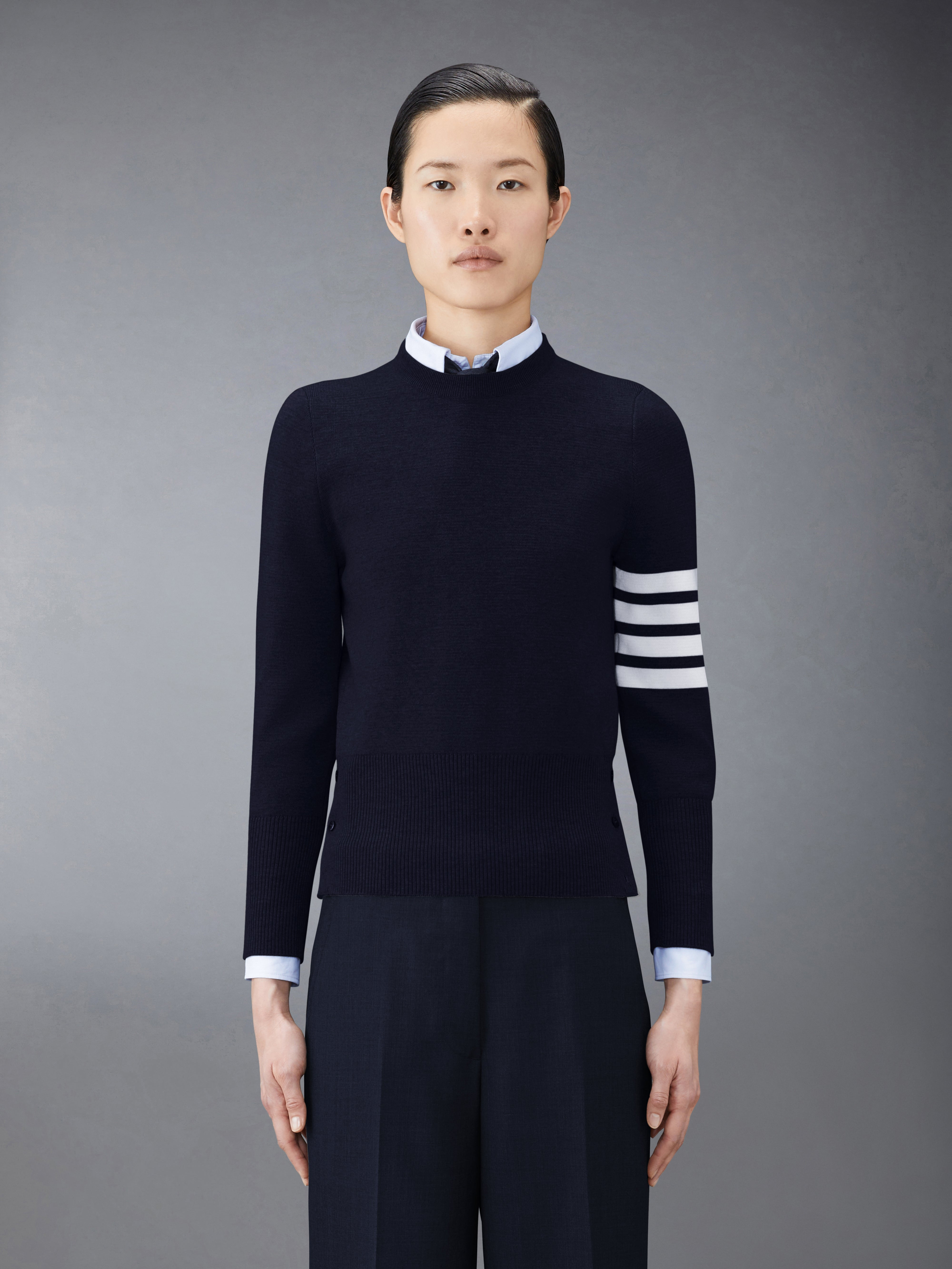 Navy Cotton Crepe Milano Stitch Crewneck 4-Bar Pullover