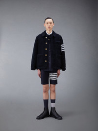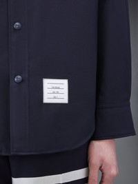 DETAILS & FIT Our Plain Weave 4-Bar Shirt Jacket strikes the balance between refined suiting and casual wear. A weighted layer perfect for cooler months, pair this jacket with any of our classic shirts. Snap front closure Buttoned cuffs Single chest pocket 4-bar stripe detail at left sleeve Name tag applique above hem -Interior pocket and name tag Signature striped grosgrain loop tab at back of neck Model is 6' 1" (185cm), wearing size 0 100% Wool Combo1: 100% Cotton Made in Italy MJO055A-06146-415