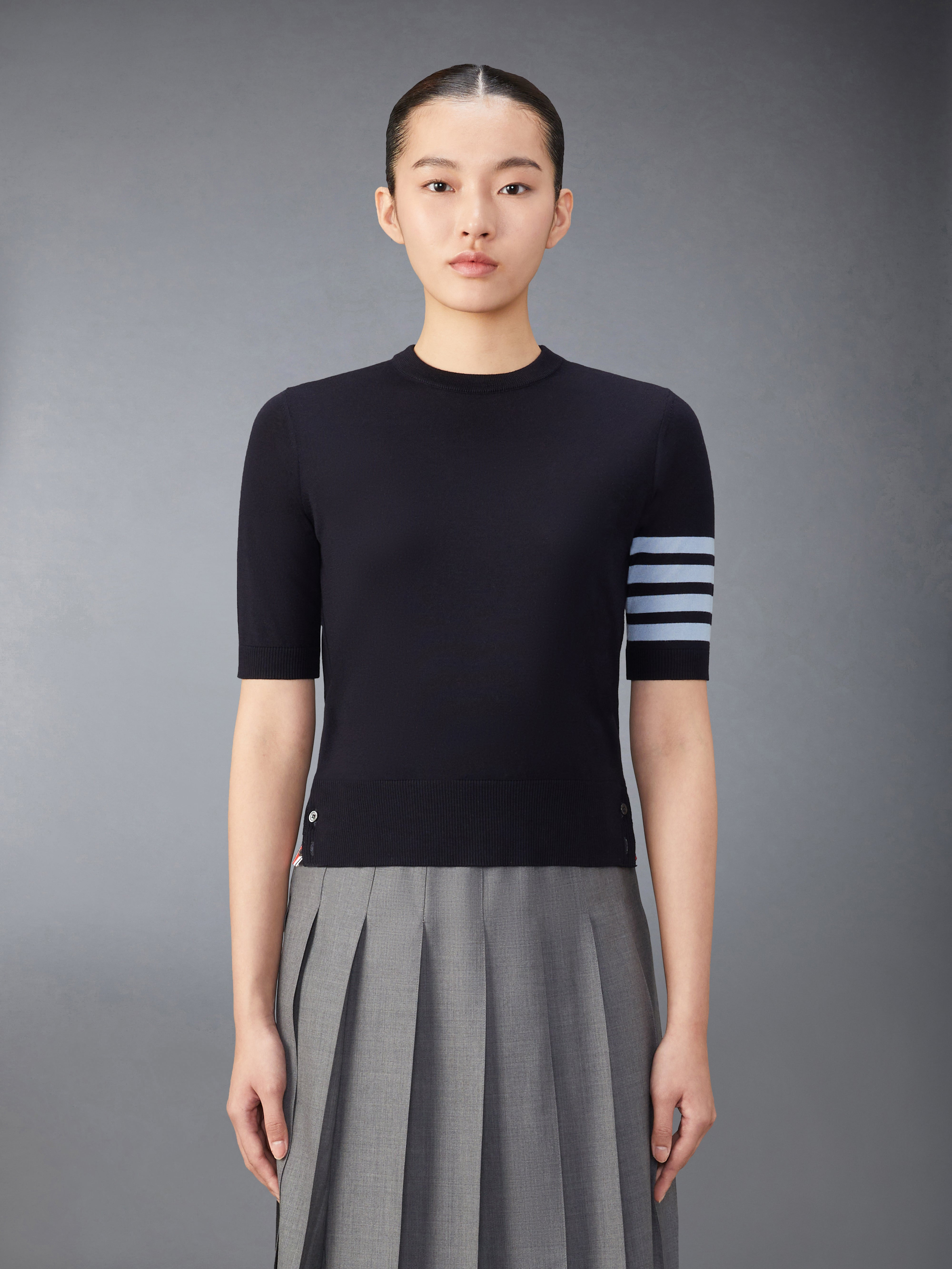 DETAILS & FIT Enduring through the ages, the silhouette of this timeless tee has weathered the test of time. Adorned with Thom Browne's signature emblems throughout, this classic jersey stitch garment is meticulously tailored to perfection. Crew neckline 4-bar detailing Button side vents with signature striped grosgrain trim Signature striped grosgrain loop tab Model is 5'10" (178 cm), wearing size 40 99% Virgin Wool, 1%Polyamide Made in Italy FKA471A-Y1014-415