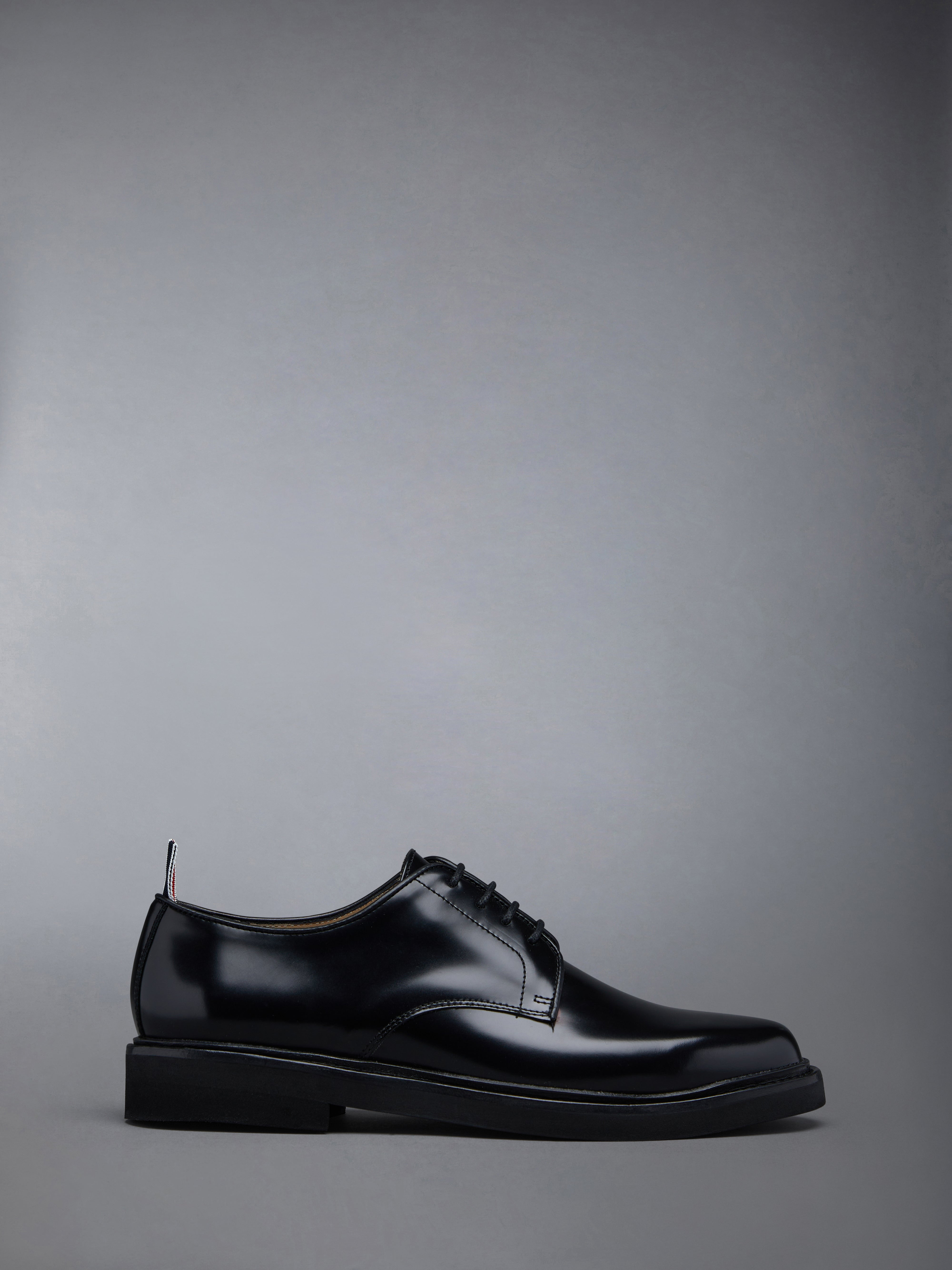 DETAILS & FIT Crafted with the highest quality of classic shoemaking, our Polished Calf Uniform Shoe is a staple in Thom Browne's legacy. Features a mirror-like shine, leather sole, and streamlined silhouette. Lace up closure -Microporous sole Leather lining Signature striped grosgrain loop tabs at heels Upper: 100% Calf Leather Sole: 100% Microporous Lining: 100% Calf Leather Made in Italy FFD036A-07524-001