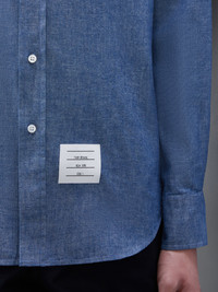 DETAILS & FIT A Thom Browne essential, our Chambray 4-Bar Shirt exhibits quality craftsmanship and meticulous tailoring. Front button closure Button down point collar patch chest pocket 4-bar stripe detail at left sleeve Pleated Buttoned cuffs Name tag applique above rounded hem Pleated back yoke with locker loop Signature striped grosgrain loop tab at back of neck Model is 6' 1" (185cm), wearing size 1 100% Cotton Made in Italy MWL272E-00111-450 - CHEST: 116.0cm - SLEEVE LENGTH: 88.0cm - Shoulder Width: 39.0cm - WAIST: 109.0cm