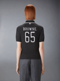 Featuring a sporty polo collar, this sweater pays homage to athletics, heritage, and craftsmanship. Bold Browne lettering and the number 65—a nod to Thom's birth year—are rendered in an iconic collegiate font, famously used at Notre Dame. Collegiate heritage is often associated with nostalgia and belonging, and it's deeply personal to Thom. This garment is not just a tribute to school pride but a symbol of the enduring desire to be part of something greater. Partial front button closure Buttoned side vents with signature striped grosgrain trim Signature striped grosgrain loop tab Model is 5'10" (178 cm), wearing size 40 100% Cashmere Made in Italy FKP127A-Y2001-025