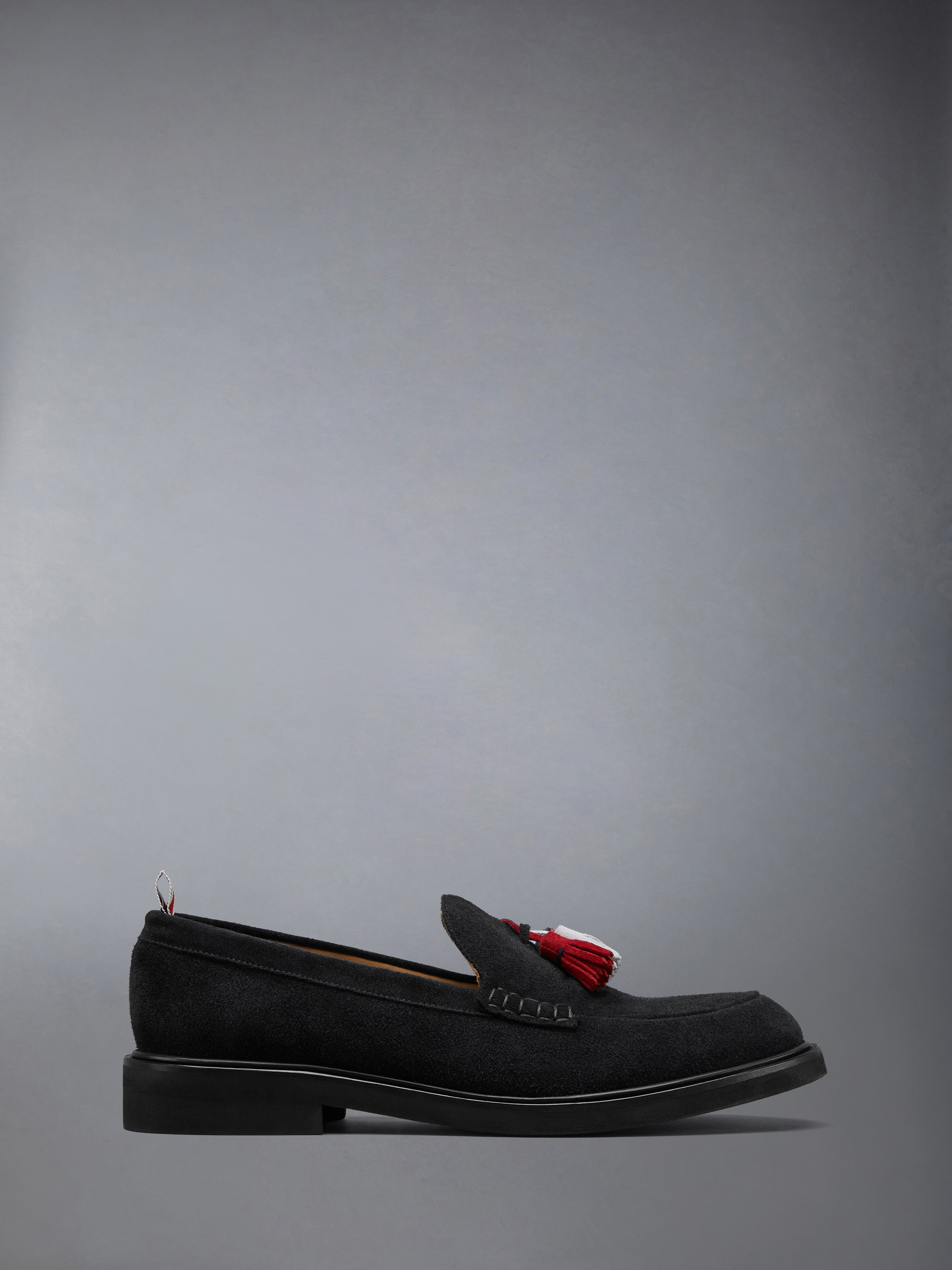 A classic loafer gets a signature Thom Browne touch with suede tassels in our distinctive brand colors. Exceptional quality, these loafers are made from durable suede fabric that will stand the test of time. Slip on Suede tassels Rubber sole Signature striped grosgrain loop tabs Upper: 100% Calf Suede Leather Sole: 100% Rubber Lining: 100% Calf Leather Made in Italy MFL069C-L0037-001