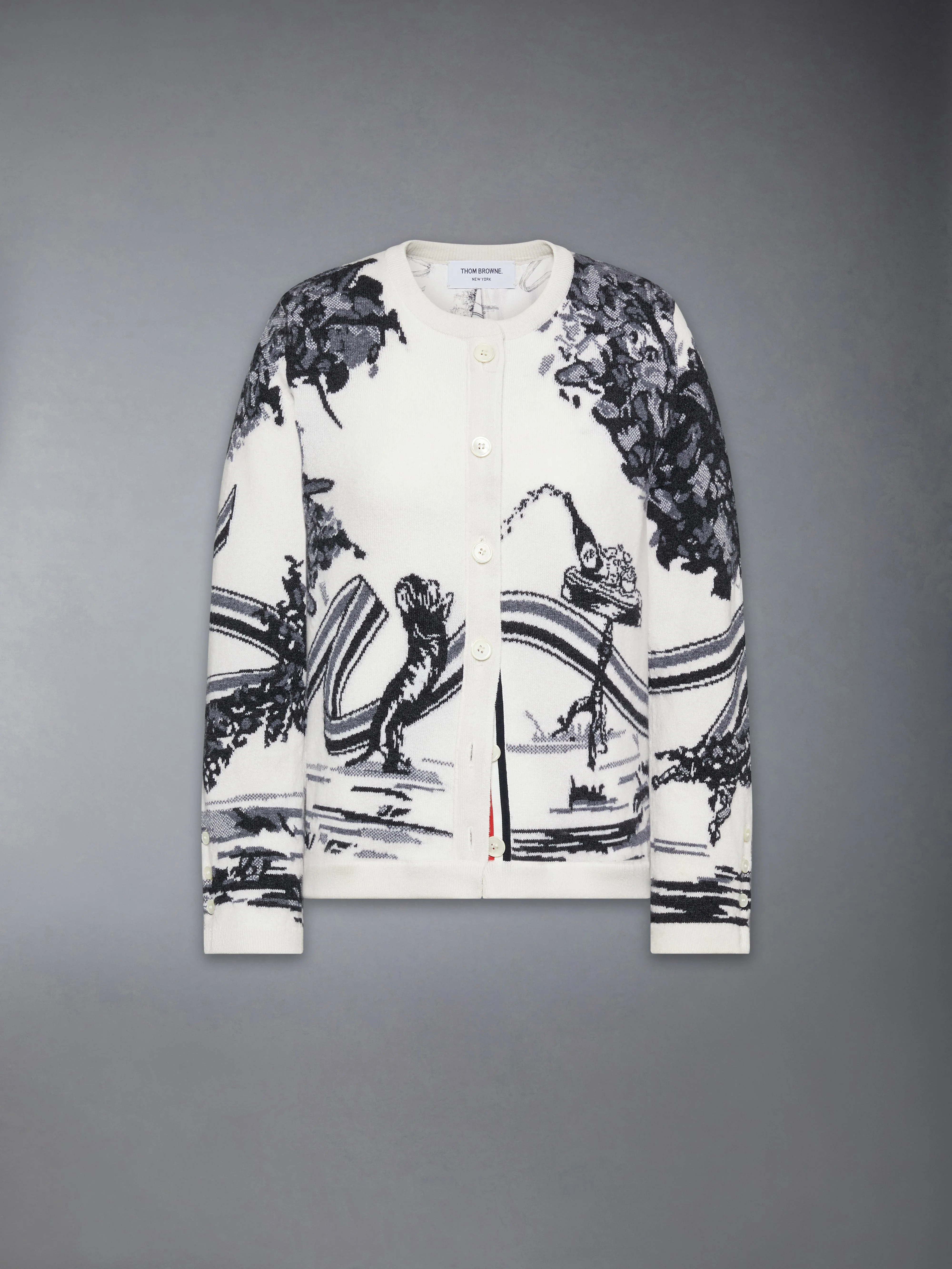 In celebration of Hector’s tenth year as a brand icon, this cashmere cardigan features a highly personal tableau that is part portrait, part pastoral dream. Drawing elements from Thom Browne’s own upstate home, the intricate intarsia depicts the beloved dachshund in a series of whimsical vignettes in a seamless visual narrative that wraps front to back. A printed silk twill lining reveals a companion toile. Front button closure with RWB grosgrain placket Ribbed neckline Ribbed buttoned cuffs with RWB grosgrain trim Ribbed hem Printed silk twill lining Signature striped grosgrain loop tab Model is 5'10" (178 cm), wearing size 42 100% Cashmere Lining 1: 100% Silk Made in the United Kingdom FKC699A-Y2001-100