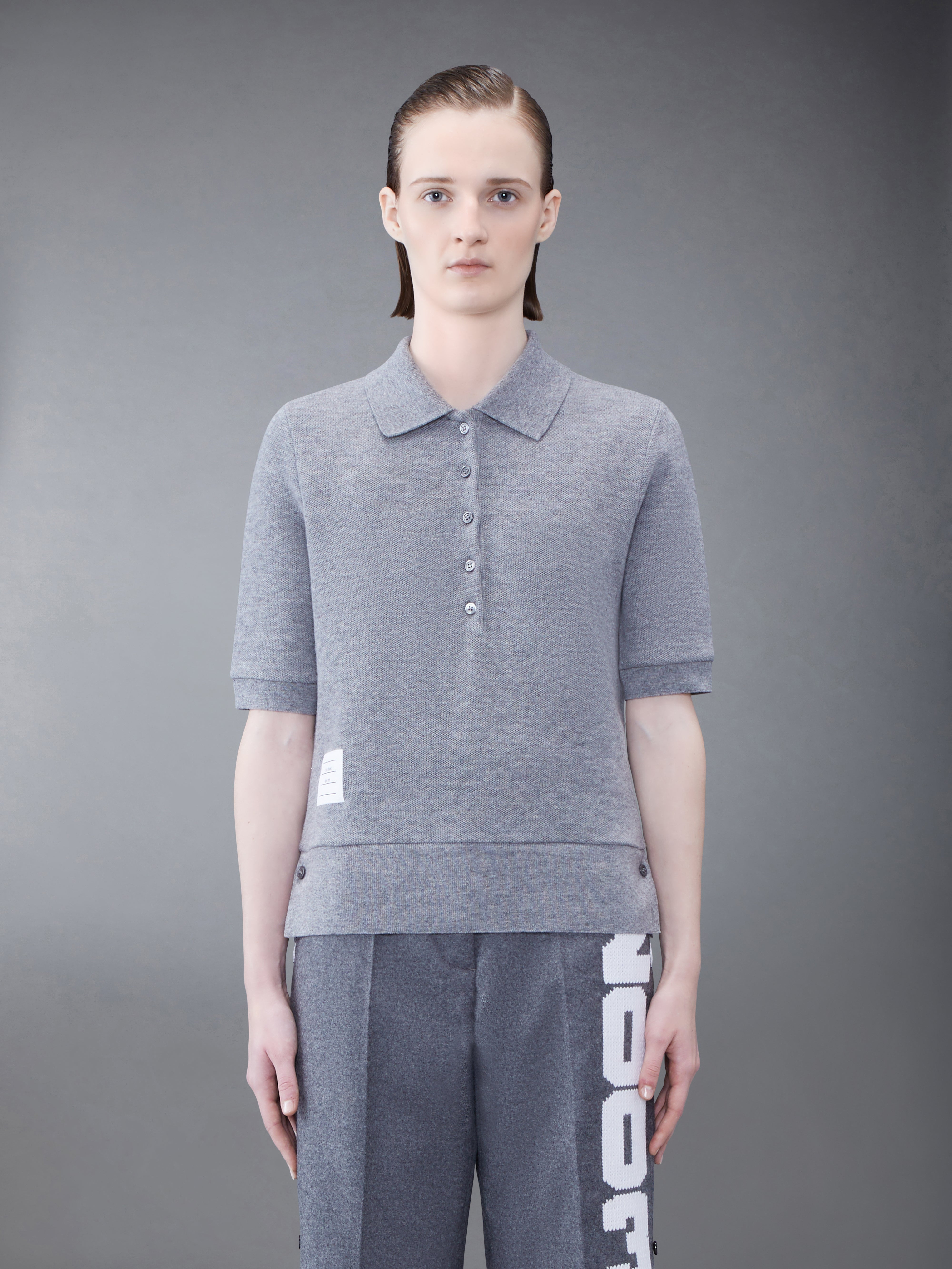 DETAILS & FIT Rib cuff polo in grey cashmere pique with embroidered '2003' detail at back in white. Partial button placket, spread collar, name tag applique above hem. Buttoned side vents with signature striped grosgrain trim. Signature striped grosgrain loop tab at back of neck. Model is 5'10" (178 cm), wearing size 40 100% Cashmere Combo 1: 50% Wool, 50% Acrylic Made in Italy FJP039E-07542-055
