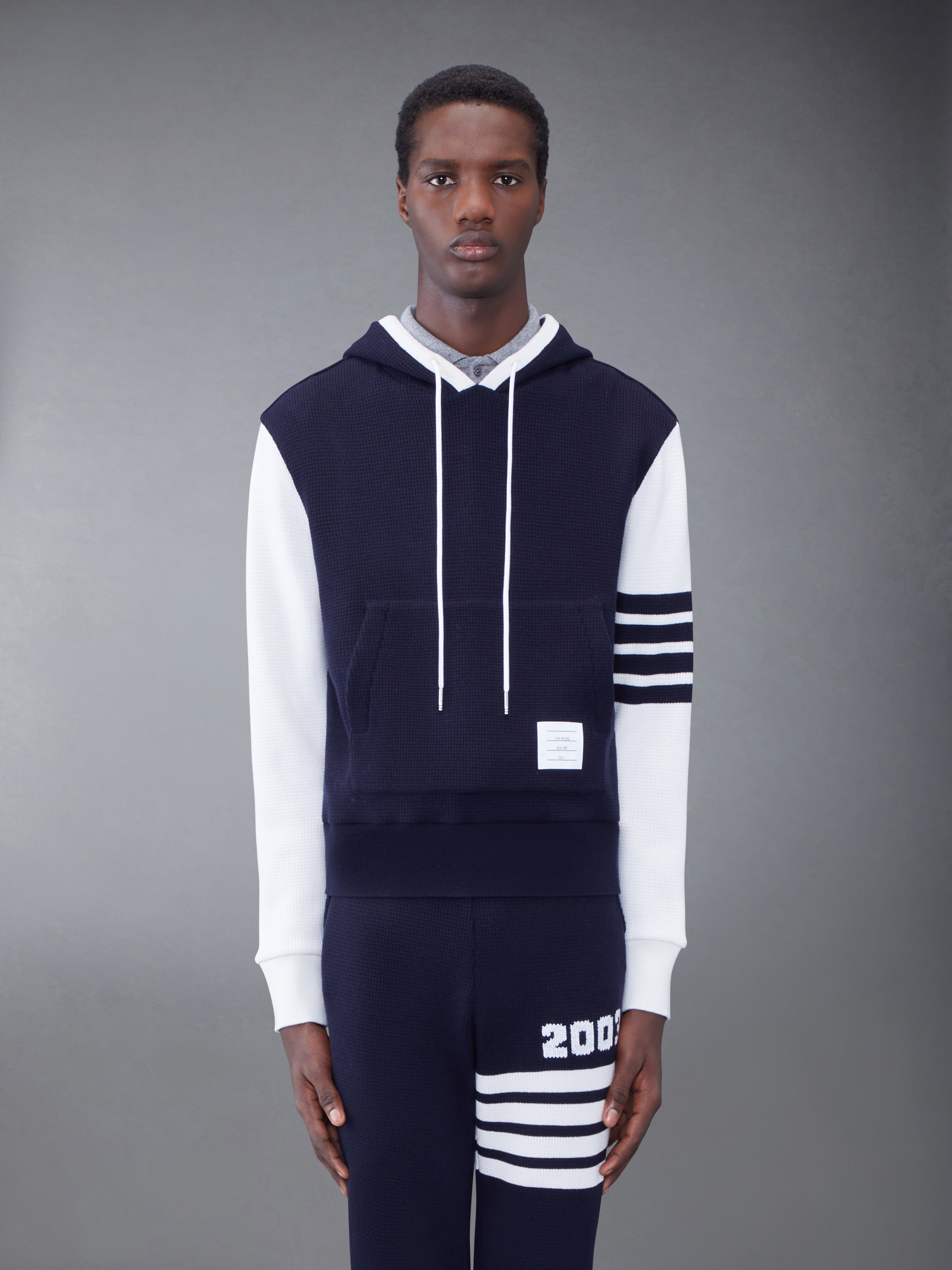 DETAILS & FIT Hooded sweatshirt in white and navy cashmere wool waffle with 4-bar stripe detail at left sleeve and '2003' intarsia at back. Crew neckline, drawstring hood, front kangaroo pocket with name tag applique. Model is 6' 1" (185cm), wearing size 1 50% Cashmere, 50% Wool Combo 1: 100% Polyester Made in Italy MJT324E-J0012-415