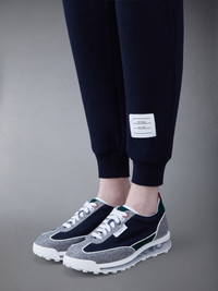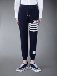 DETAILS & FIT Sweatpants in navy cashmere waffle knit with embroidered '2003' and engineered 4-bar stripe detail at left thigh in white. Drawstring waistband with brass aglets, name tag applique above left cuff. Slant side pockets. Signature striped grosgrain loop tab at back waist. Model is 5'10" (178 cm), wearing size 40 50% Cashmere, 50% Wool Combo 1: 50% Wool, 50% Acrylic Made in Italy FJQ073E-J0012-415