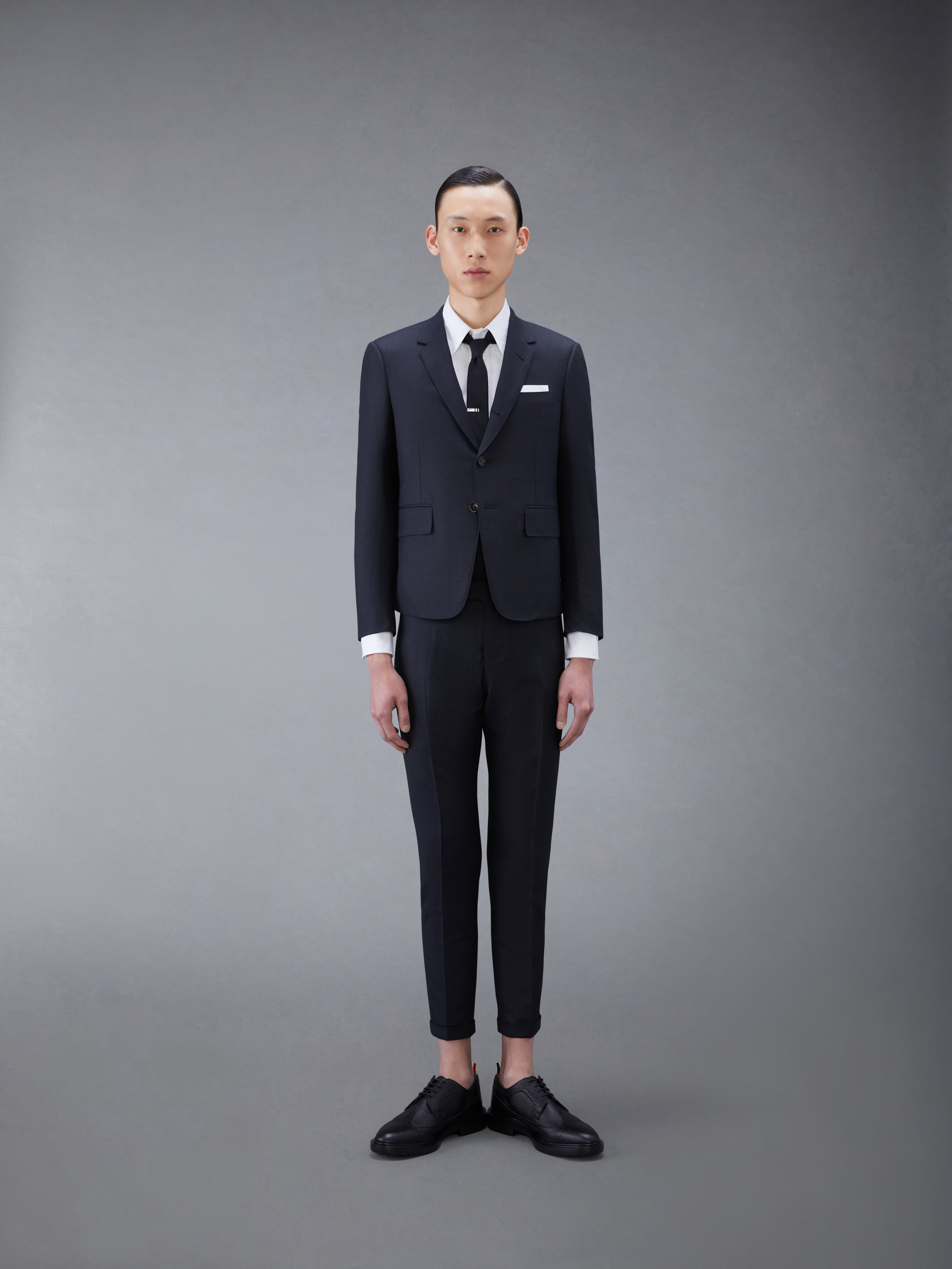DETAILS & FIT Our Twill Slim Fit Suit and Tie embraces a slimmer fit taken from punk influences while remaining true to Thom Browne’s classic heritage. Since its introduction, the slim-fit suit has maintained its loyal devotees. Front button closure Notched lapels 3 flap front pockets, single chest pocket Buttoned cuffs with signature striped grosgrain trim Double back vent Striped sport coat lining with interior pocket and name tag Tab trouser closure Adjustable buttoned side tabs Slip side pockets, Button-fastening jetted hip pockets Creased legs Narrow cuffs Signature striped grosgrain loop tab at back of neck and waist Classic slim tie High ArmholeFit 3 Model is 6' 1" (185cm), wearing size 0 100% Wool Lining: 100% Cupro Made in Italy MSC159A-00626-015