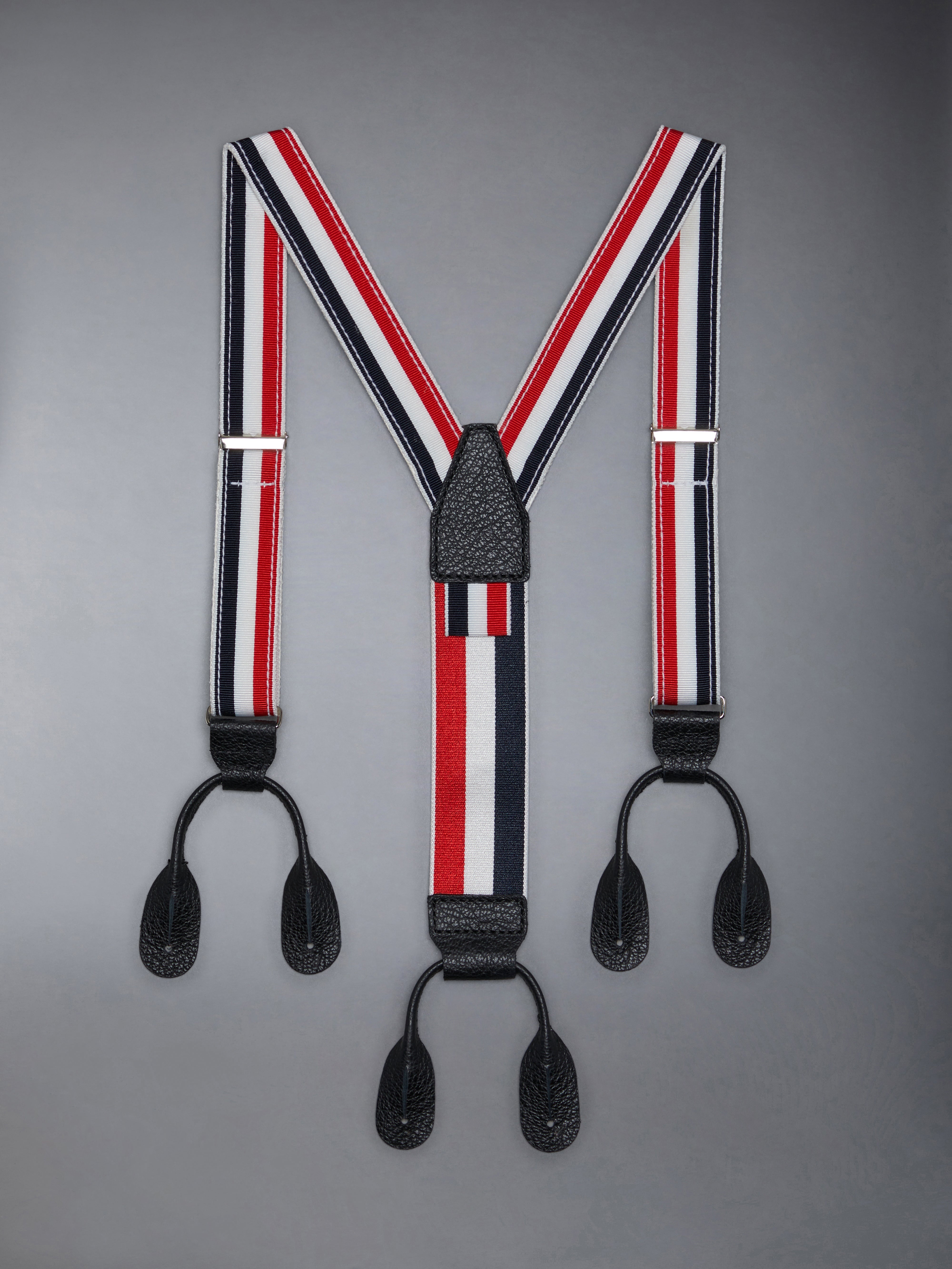 Kid's Suspenders in 24mm striped poly grosgrain. Black pebble grain leather details and button-fastening attachments. Silver tone metal adjusters. 100% Polyester Made in Italy KCX003A-T0043-960