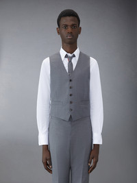 DETAILS & FIT Our Twill 5-Button Vest exudes Thom Browne's mastery of minimalistic design and tailored excellence. A front button closure is at center, while a striped panel and our iconic striped grosgrain loop tab rests at the back. V-neckline Front button closure Striped back panel Adjustable Buttoned backstrap Striped Interior with name tag applique Signature striped grosgrain loop tab at back of neck Model is 6' 1" (185cm), wearing size 0 100% Wool Lining: 100% Cupro Made in Italy MVC001A-00626-035
