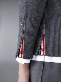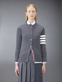 A signature Thom Browne emblem defines our Classic Cashmere 4-Bar Crew Neck Cardigan. Presented in 100% rich cashmere, this cardigan is a longstanding staple. Front button closure with striped grosgrain placket 4-bar stripe detail at left sleeve Buttoned side vents and cuffs with signature striped grosgrain trim Signature striped grosgrain loop tab at back of neck Model is 5' 10" (178cm), wearing size 40 100% Cashmere Made in the UK FKC002A-00011-025