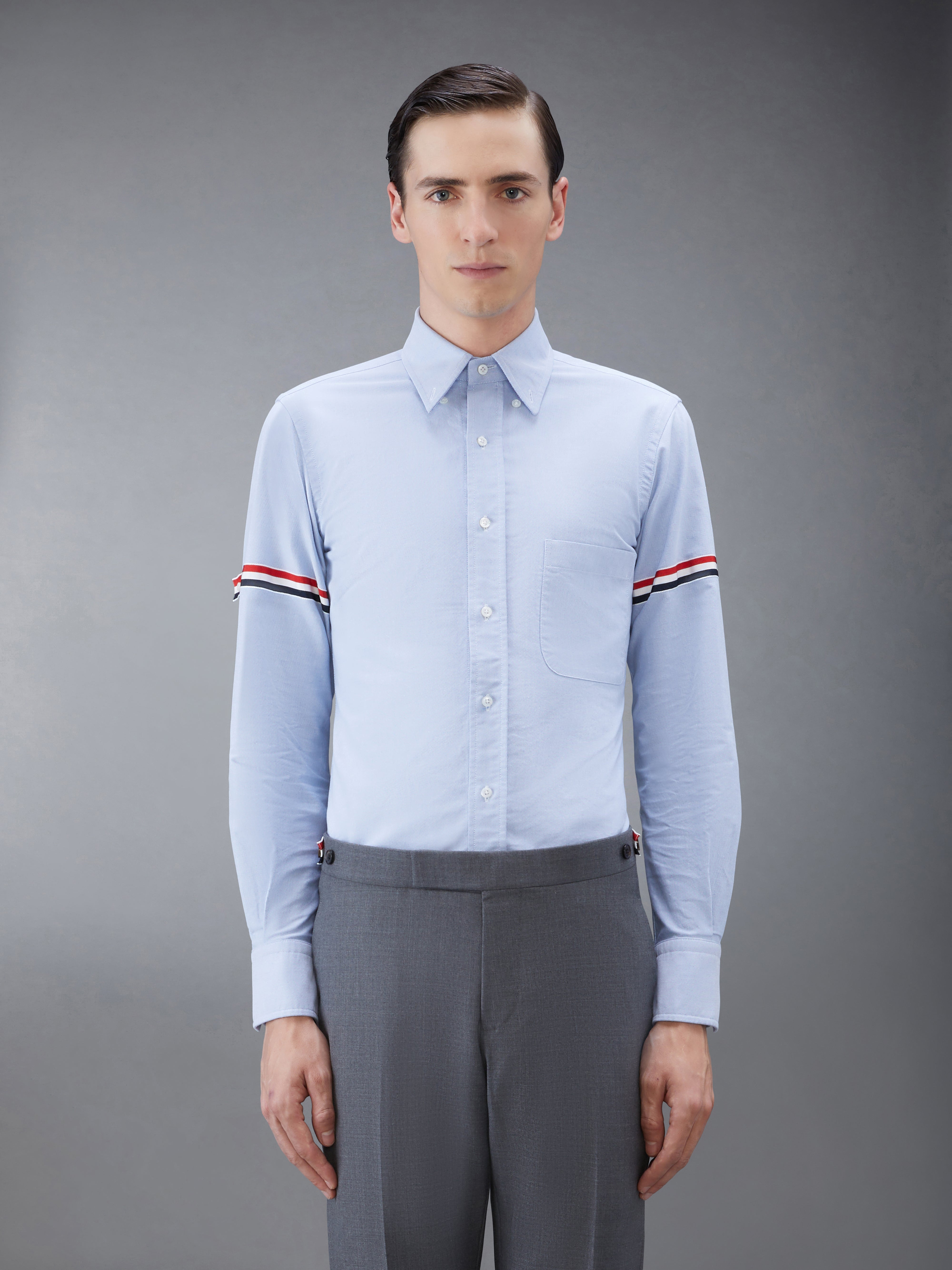DETAILS & FIT A Thom Browne essential, our Oxford Point Collar Classic Shirt with grosgrain armbands exhibits quality craftsmanship and meticulous tailoring. Grosgrain armbands on sleeve Front button closure Button down point collar Patch chest pocket Name tag applique above curved hem Buttoned cuffs Signature striped grosgrain loop tab at back of neck 100% Cotton Made in Italy MWL150E-F0313-480
