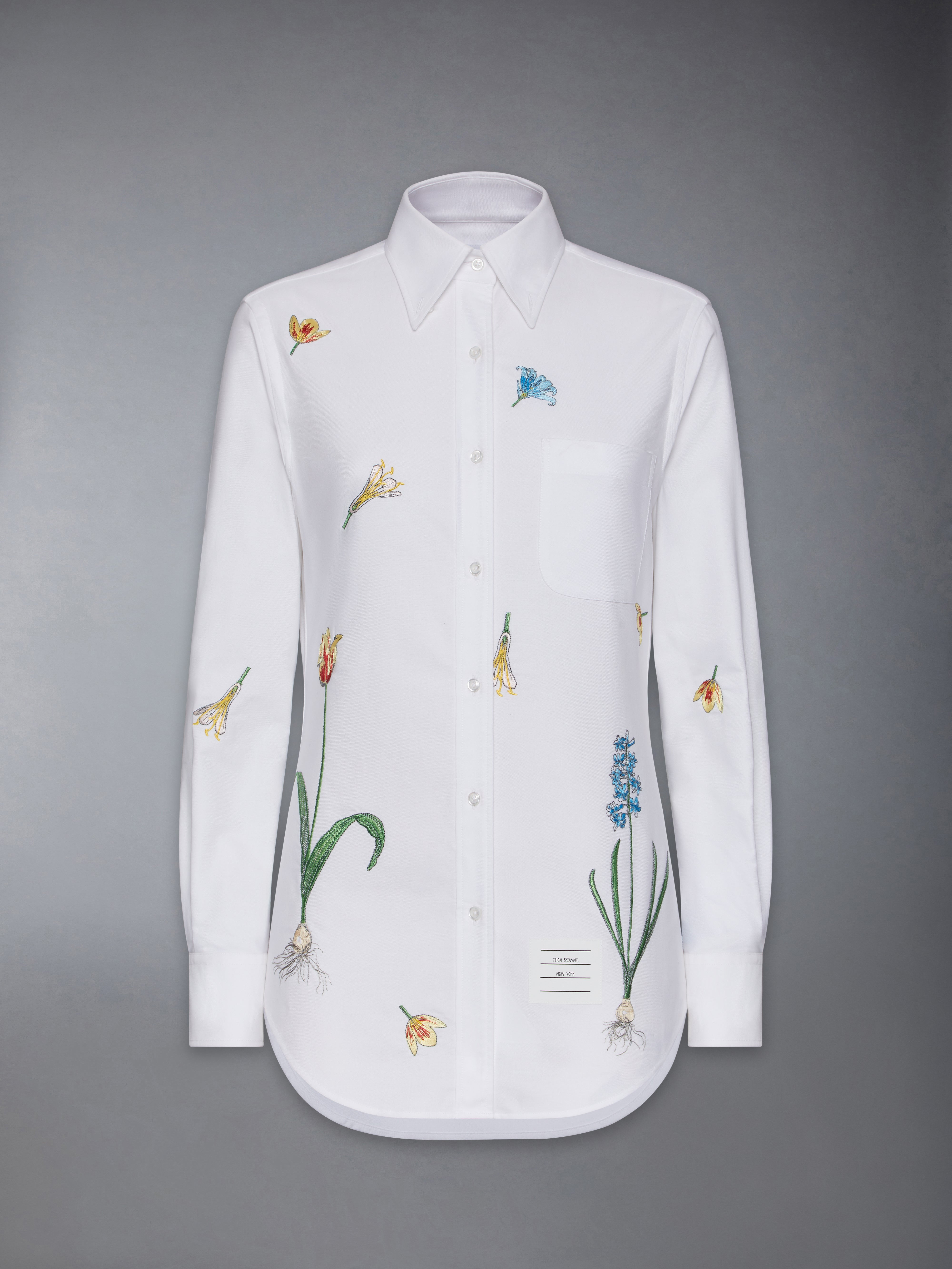 DETAILS & FIT Bring the beauty of nature to your wardrobe and bloom with the season in this enchanting dress shirt, featuring delicate flowers embroidered with a satin stitch. Front button closure Name tag applique Pleated back yoke with locker loop Signature striped grosgrain loop tab Model is 5'10" (178 cm), wearing size 40 100% Cotton Combo 1: 100% Polyester Made in Italy FLL005E-E1246-100
