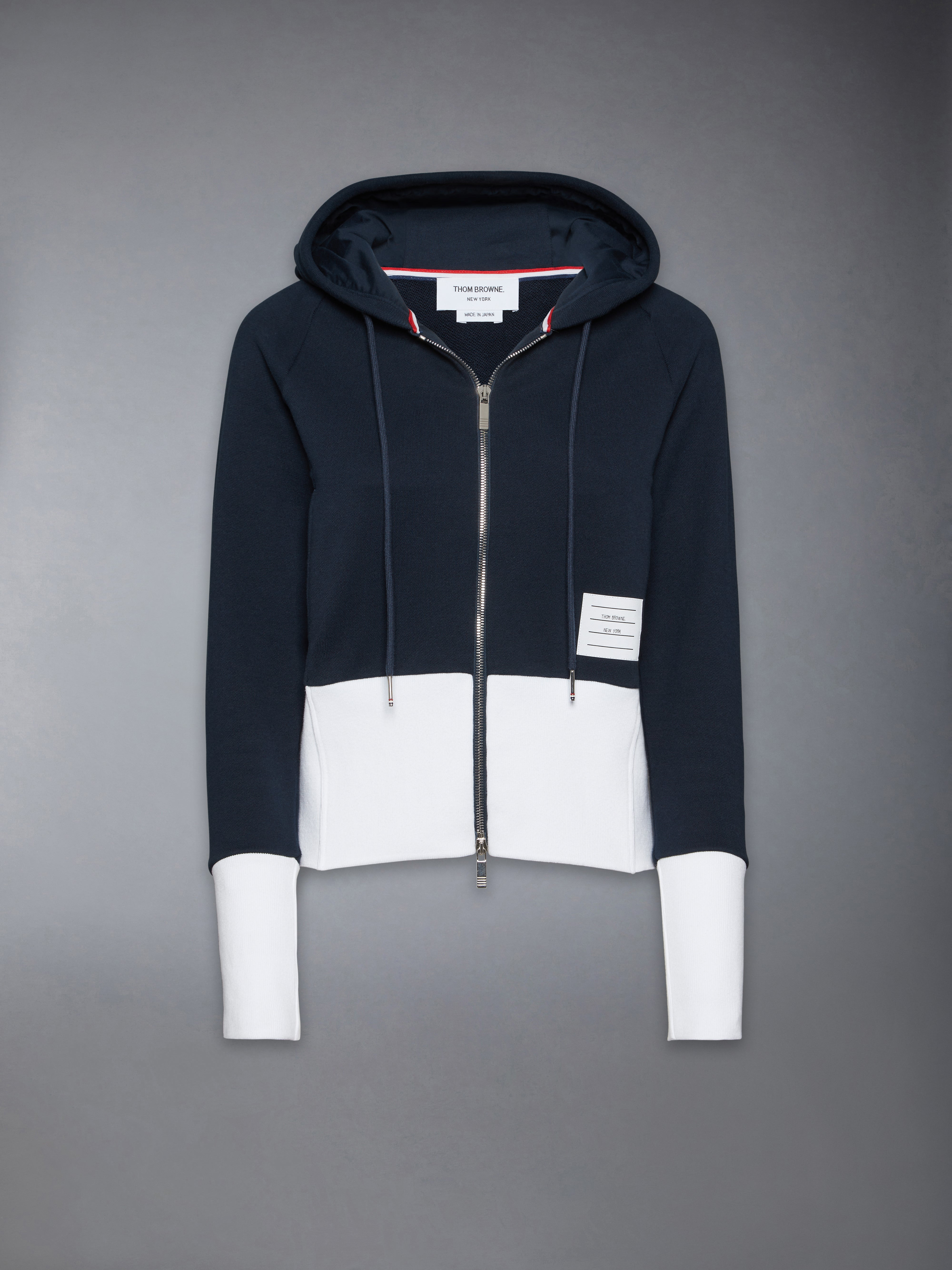 DETAILS & FIT Leisurewear made artful. A signature Thom Browne emblem defines this piece — 4-Bar detailing. Made with a zip-up closure for easy on/off wear. Pair it with our Classic 4-Bar Jersey Sweatpants. Front zip closure 4-bar detailing Name tag applique Side slip pockets Drawstring hood Model is 5'10" (178 cm), wearing size 40 100% Cotton Made in Japan FJT382A-03037-415