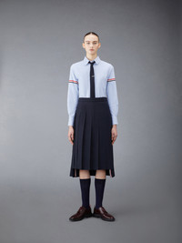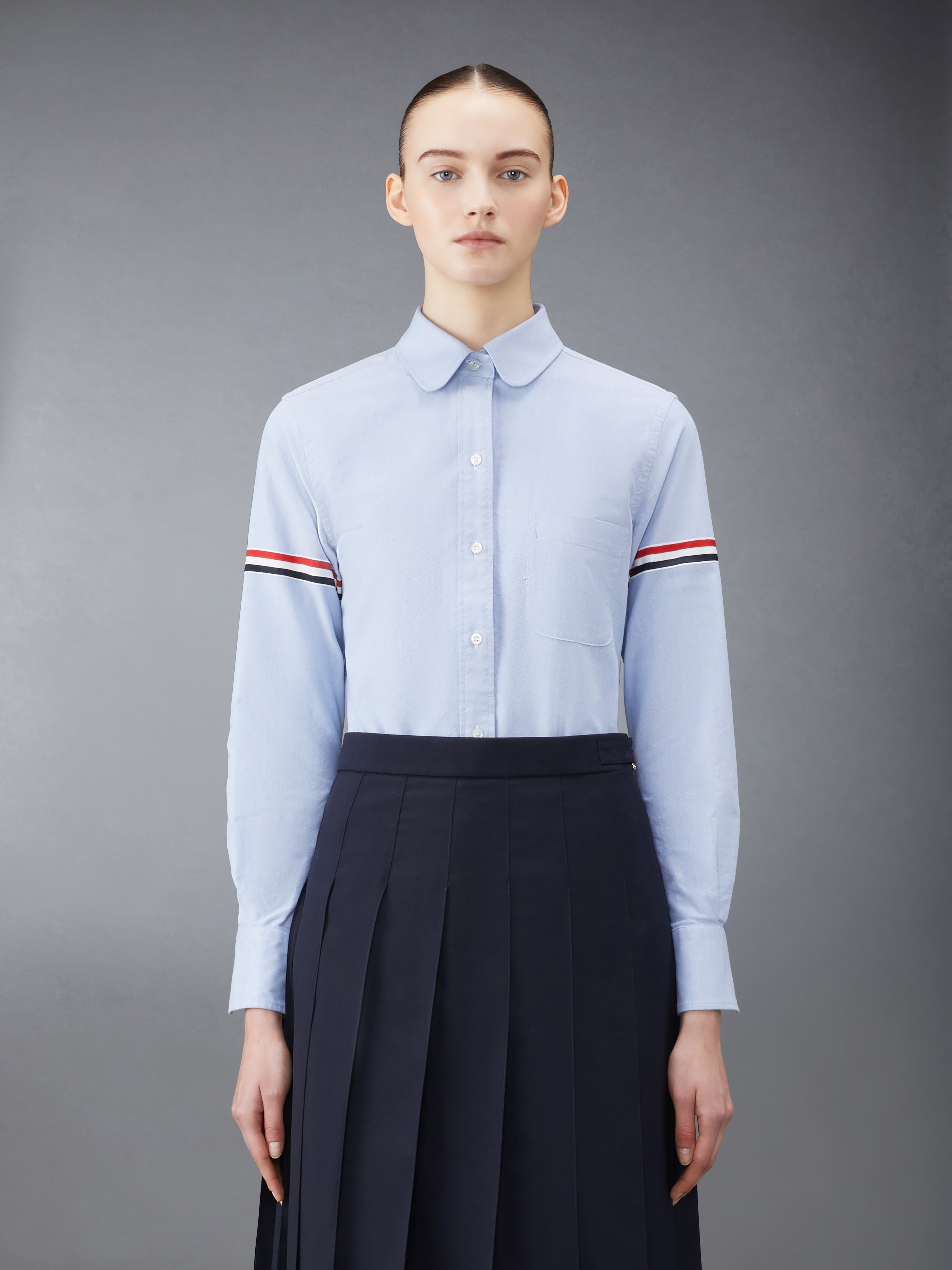 DETAILS & FIT A Thom Browne essential, our Oxford Round Collar Armbands Classic Shirt exhibits quality craftsmanship and meticulous tailoring. Armbands on sleeve Front button closure Patch chest pocket Name tag applique above Rounded hem Signature striped grosgrain loop tab at back of neck 100% Cotton Made in Italy FLL019E-F0313-480