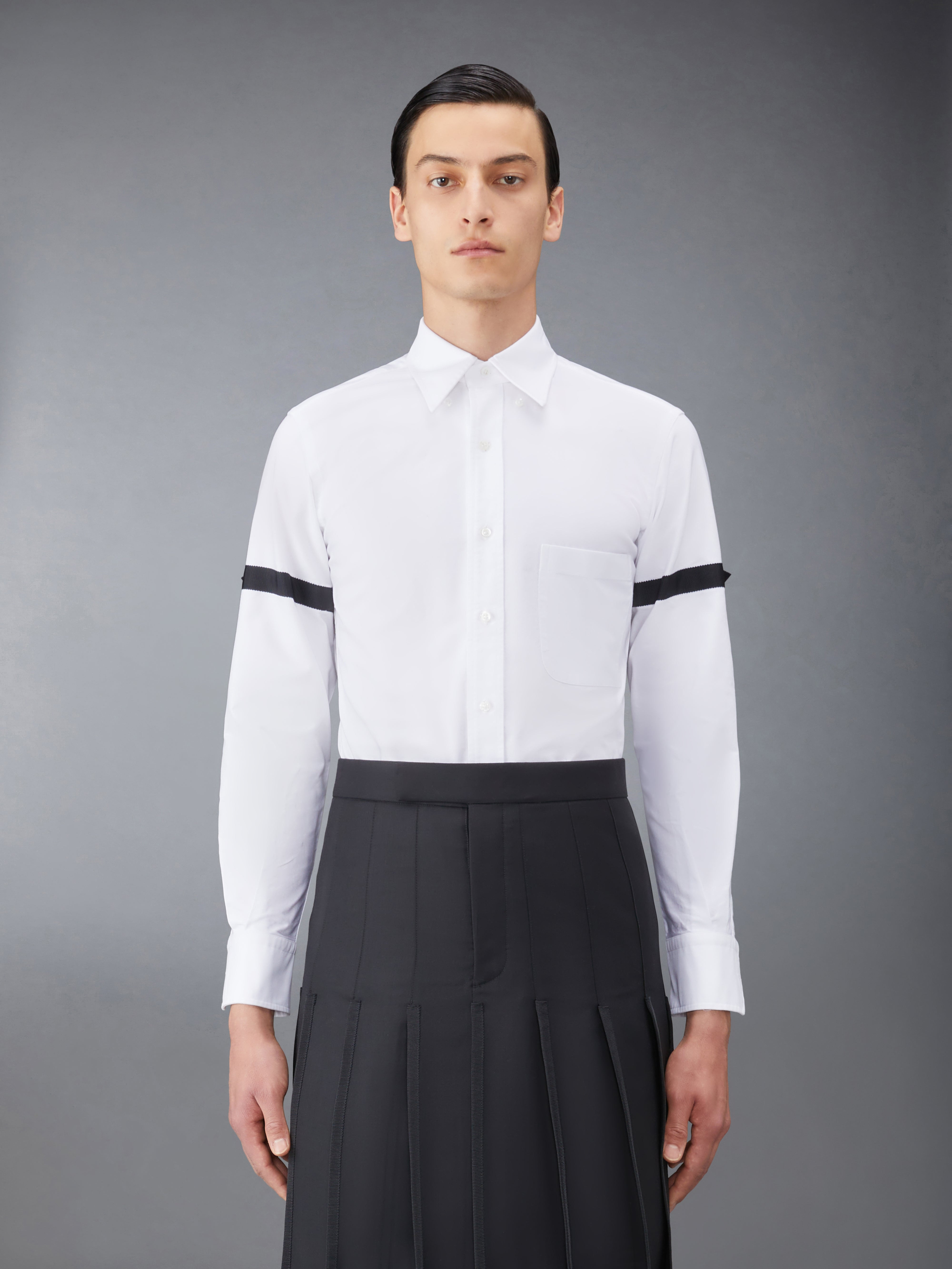 DETAILS & FIT A Thom Browne essential, our Oxford Armband Shirt in Multicolor Black/White exhibits quality craftsmanship and meticulous tailoring. Front zip closure Spread polo neckline Striped grosgrain armbands Side Slip pockets Signature striped grosgrain loop tab at back of neck Model is 6' 1" (185cm), wearing size 1 100% Cotton Made in Italy MWL150B-F0313-980