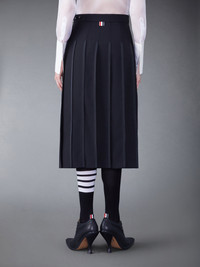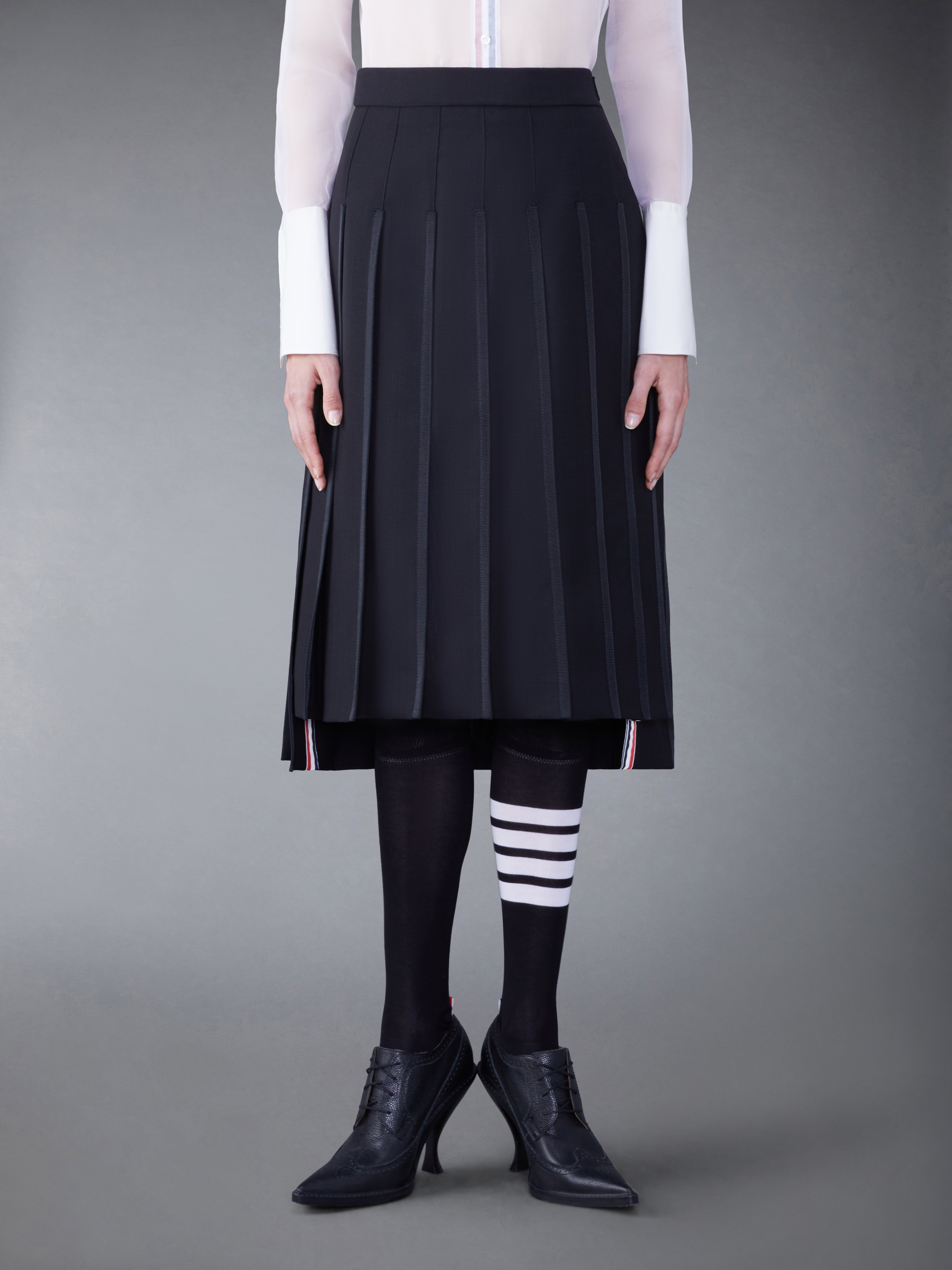 DETAILS & FIT Sharp and refined, this classic skirt was inspired by East Coast preppy icons but reimagined with Thom Browne's signature proportions and meticulous craftsmanship. Side zip closure Dropped back hem with signature grosgrain trim Signature grosgrain loop tab at back waist Model is 5'10" (178 cm), wearing size 40 100% Wool Lining: 100% Cupro FGC400B-00473-001