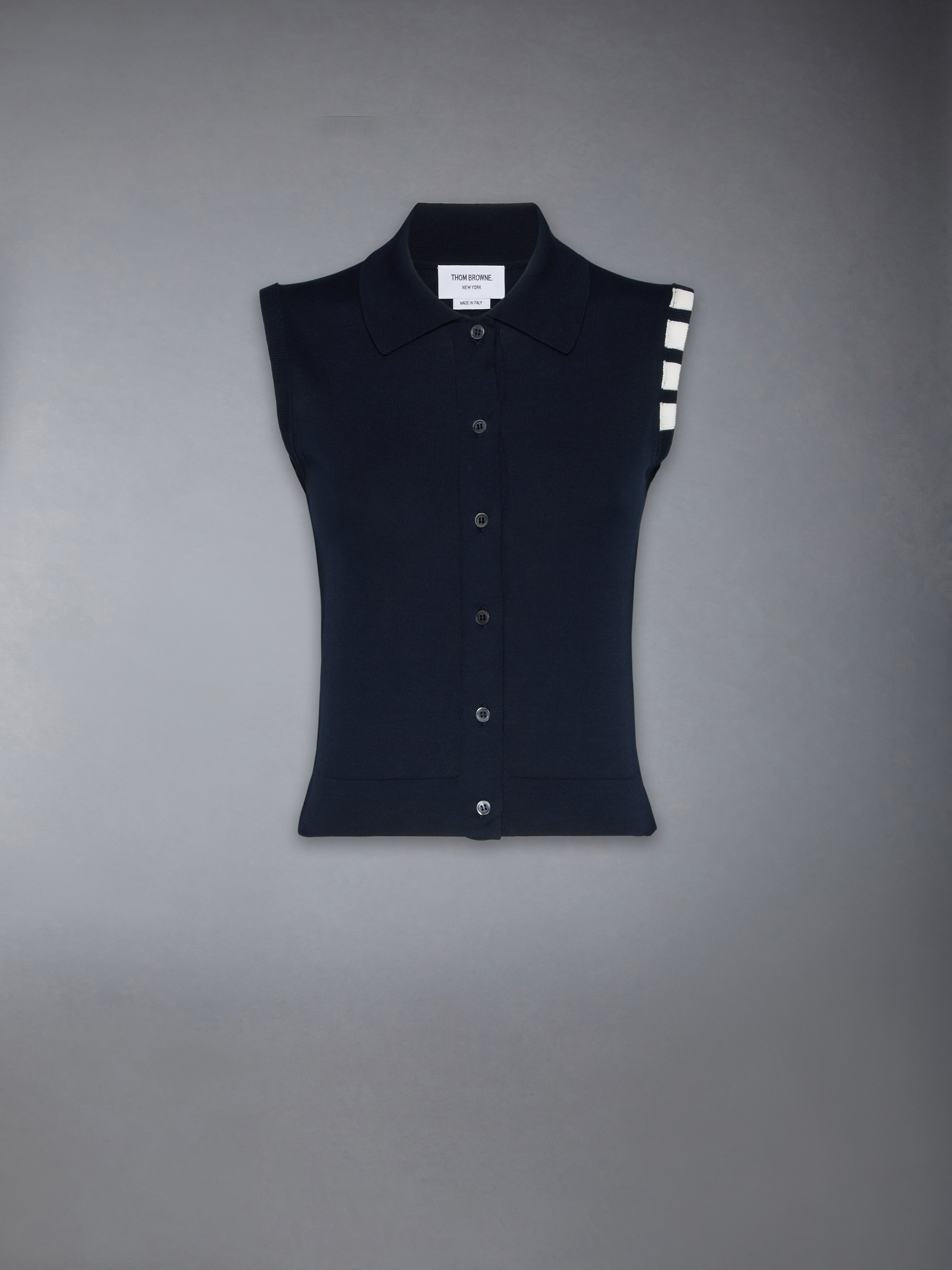 DETAILS & FIT A silhouette that has stood the test of time, this luxe sweater is adorned with signature Thom Browne emblems throughout and tailored to perfection. Layer it over any of our signature dress shirts on cool spring days. Front button closure 4-bar detailing Buttoned side vents with signature striped grosgrain trim Signature striped grosgrain loop tab Model is 5'10" (178 cm), wearing size 40 100% Cotton Made in Italy FKL002A-Y3036-415
