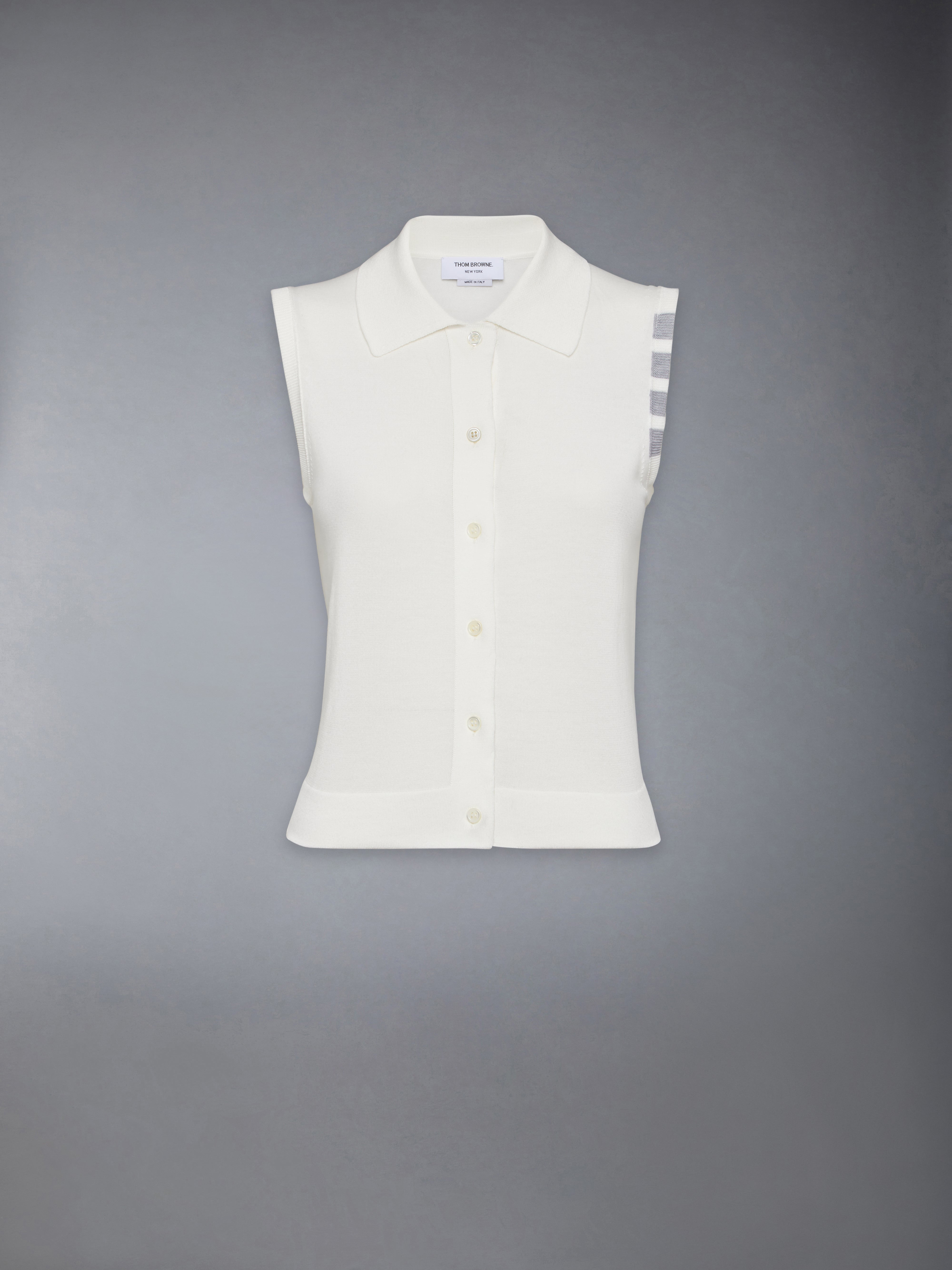 DETAILS & FIT A silhouette that has stood the test of time, this luxe sweater is adorned with signature Thom Browne emblems throughout and tailored to perfection. Layer it over any of our signature dress shirts on cool spring days. Front button closure 4-bar detailing Buttoned side vents with signature striped grosgrain trim Signature striped grosgrain loop tab Model is 5'10" (178 cm), wearing size 40 100% Cotton Made in Italy FKL002A-Y3036-100