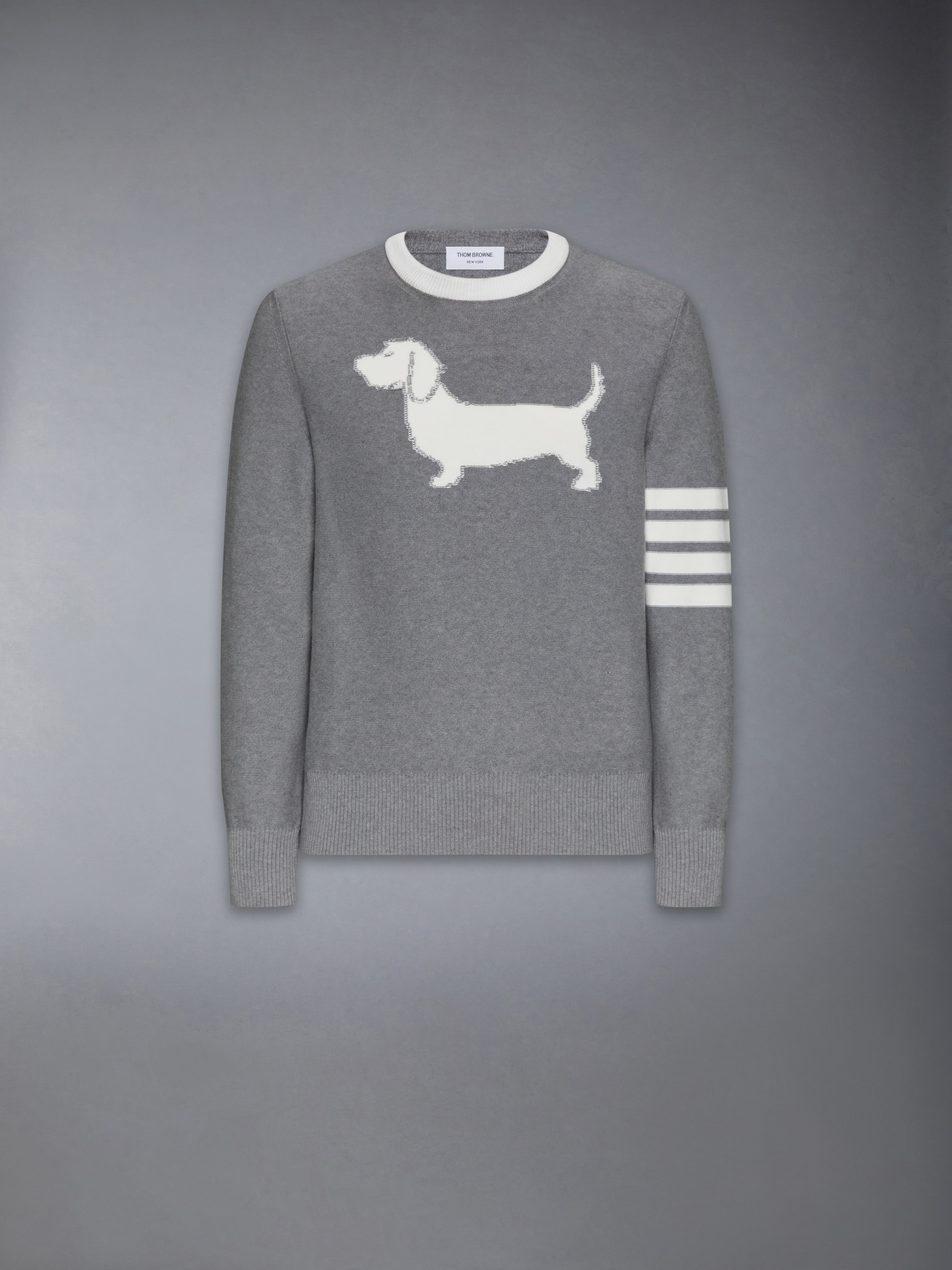 DETAILS & FIT Hector adorns the front of this seasonal pullover. Heralded as the most famous dog muse in fashion, Thom Browne’s very own dachshund served as the inspiration behind this quintessential piece. Perfect for cool spring nights. 4-bar detailing Buttoned cuffs with signature striped grosgrain trim Signature striped grosgrain loop tab Model is 6'1" (185cm), wearing size 1 100% Cotton Made in Italy MKA544A-Y3006-055