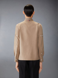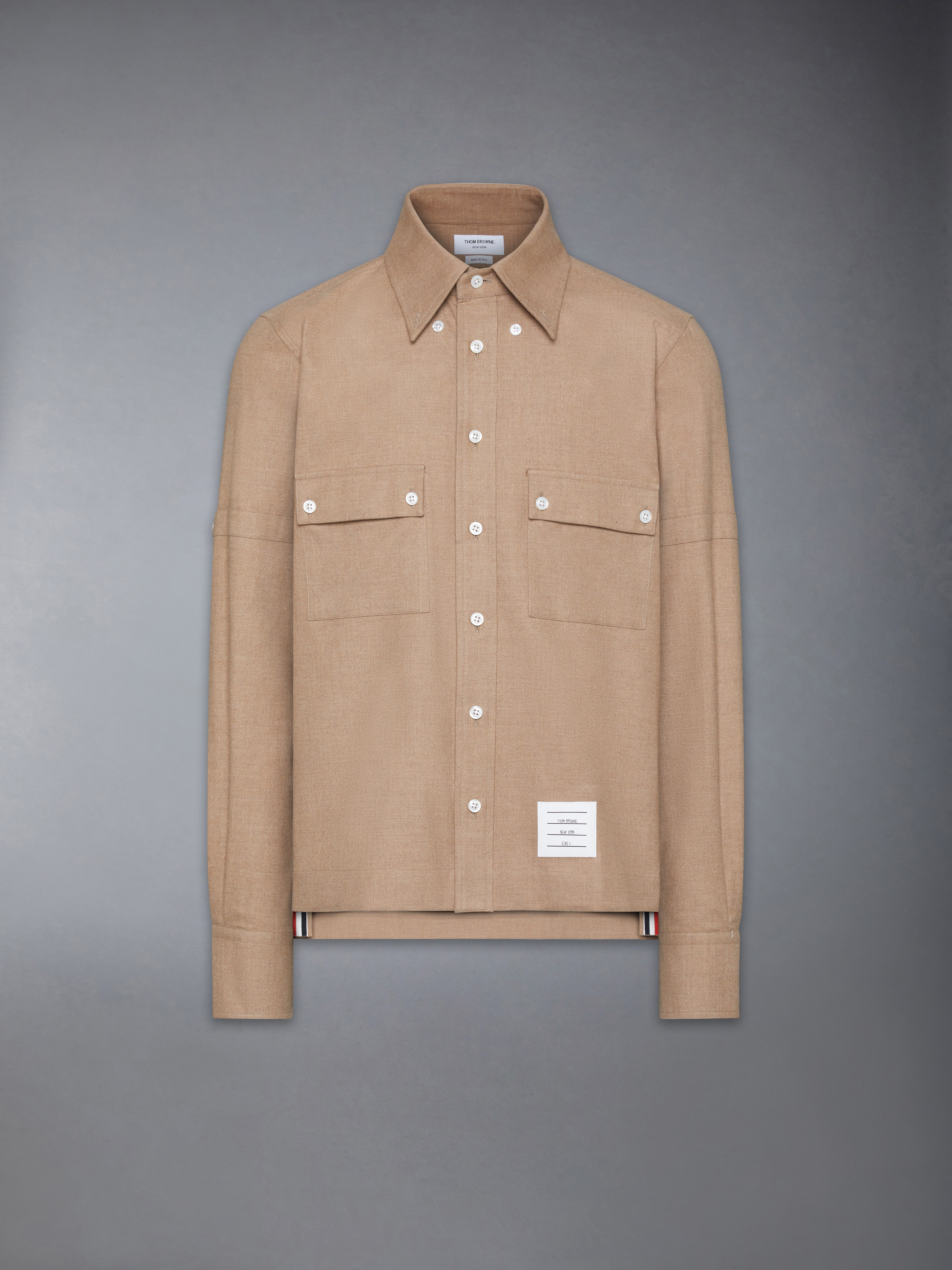 Functional yet refined, this classic utility shirt features two spacious pockets—perfect for keeping essentials close at hand. Signature Thom Browne emblems, from our grosgrain trim to our name tag applique, add a touch of elegance. Crafted from luxuriously warm flannel fabric, it’s a year-round staple that layers effortlessly over a casual tee. Complete the look with our Calf Suede RWB-Stripe Chelsea Boots. Straight fit Front button closure Chest flap pockets with button fastening Name tag applique Buttoned armbands Buttoned side vents with signature striped grosgrain trim Pleated back yoke with locker loop Signature striped grosgrain loop tab Model is 6'1" (185cm), wearing size 1 100% Cotton Made in Italy MWL425O-F0796-215
