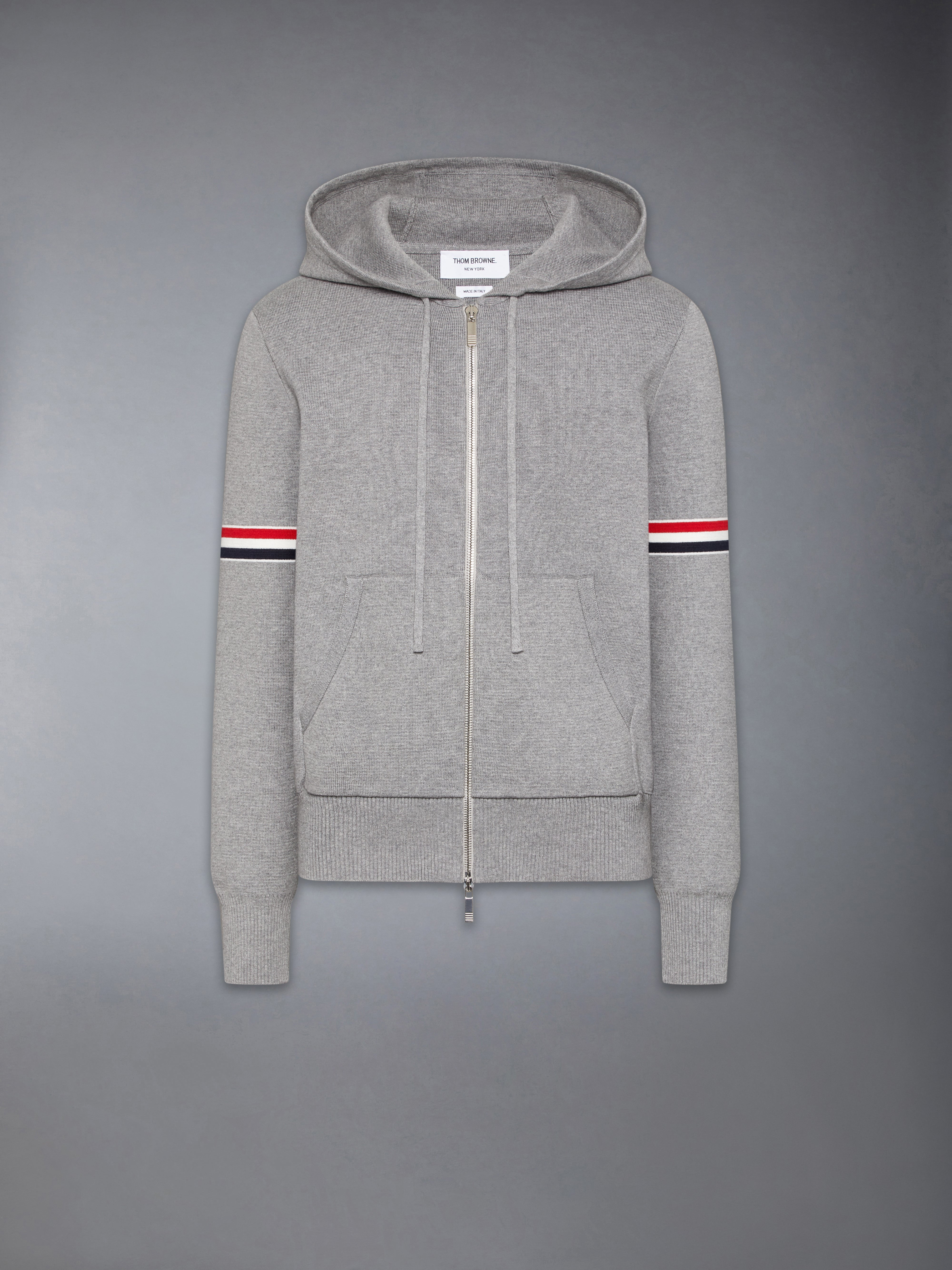 Zip hoodie in navy Milano stitch cotton with striped grosgrain armbands. 2-way zip closure, drawstring hood, slant welt side pockets. Buttoned cuffs with signature striped grosgrain trim. Model is 6' 1" (185cm), wearing size 0. 100% Cotton Made in Italy MKT008A-Y3007-055