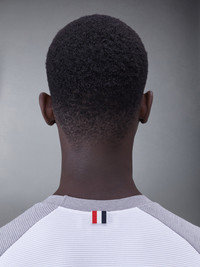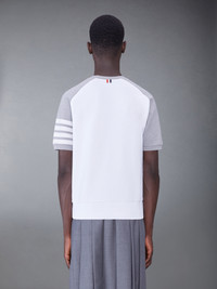 Short-sleeved sweatshirt in white cotton ottoman rib with light grey saddle sleeves and 4-bar stripe detail at left sleeve in white. Crew neckline. Name tag applique above hem. Signature striped grosgrain loop tab at back of neck. Model is 6' 1"; (185mm), wearing size 0. 100% Cotton MJT321A-08138-055