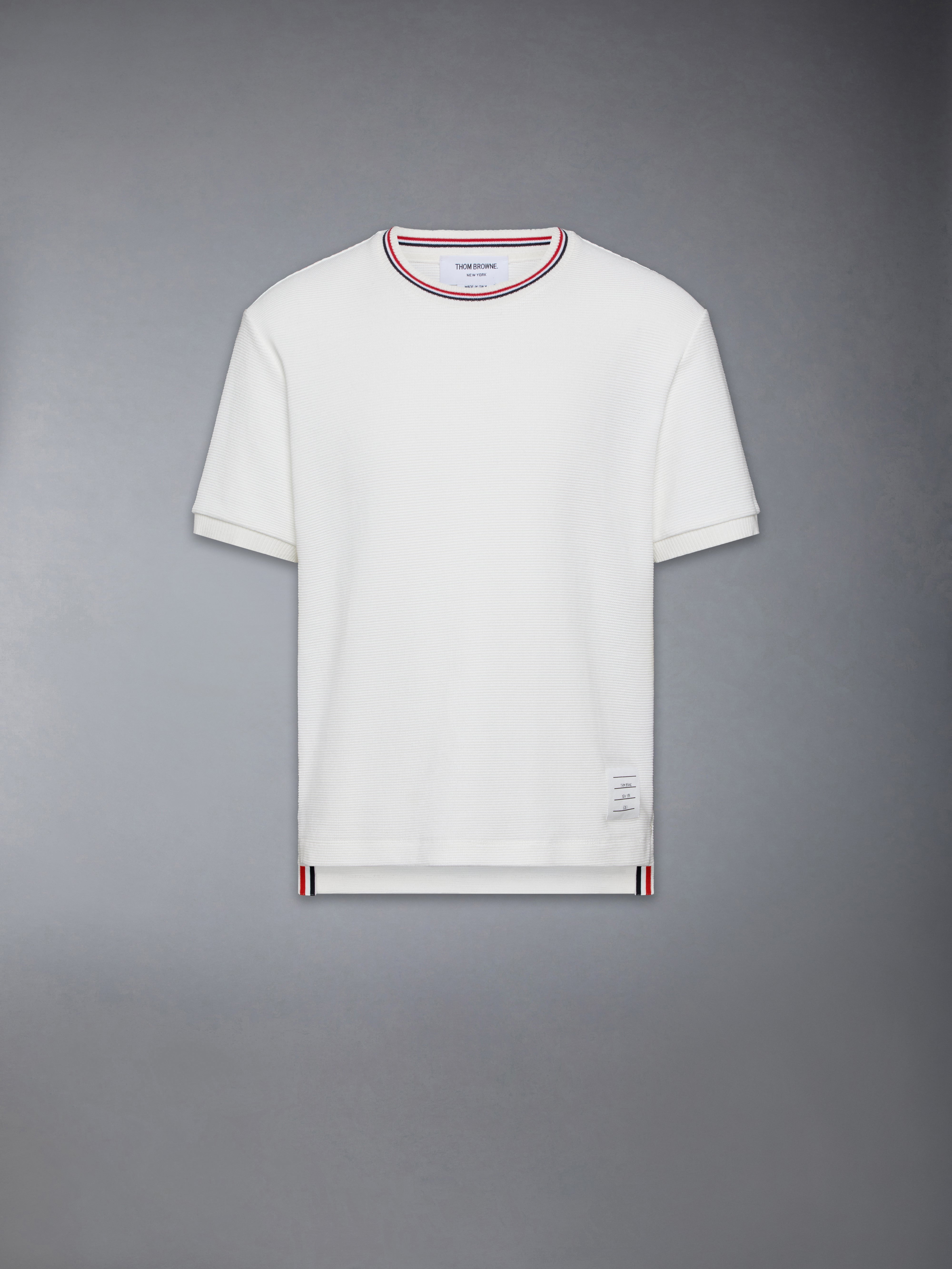 The epitome of quiet luxury, this cotton waffle tee features subtle Thom Browne emblems at the hem, side vents, and collar. Elevate simple slacks or dress shorts with this casual, everyday staple. Name tag applique Buttoned side vents with signature striped grosgrain trim Dropped back hem Signature striped grosgrain loop tab Model is 6'1" (185cm), wearing size 1 100% Cotton Made in Italy MJS287A-J0216-113 MJS287A-J0216-113