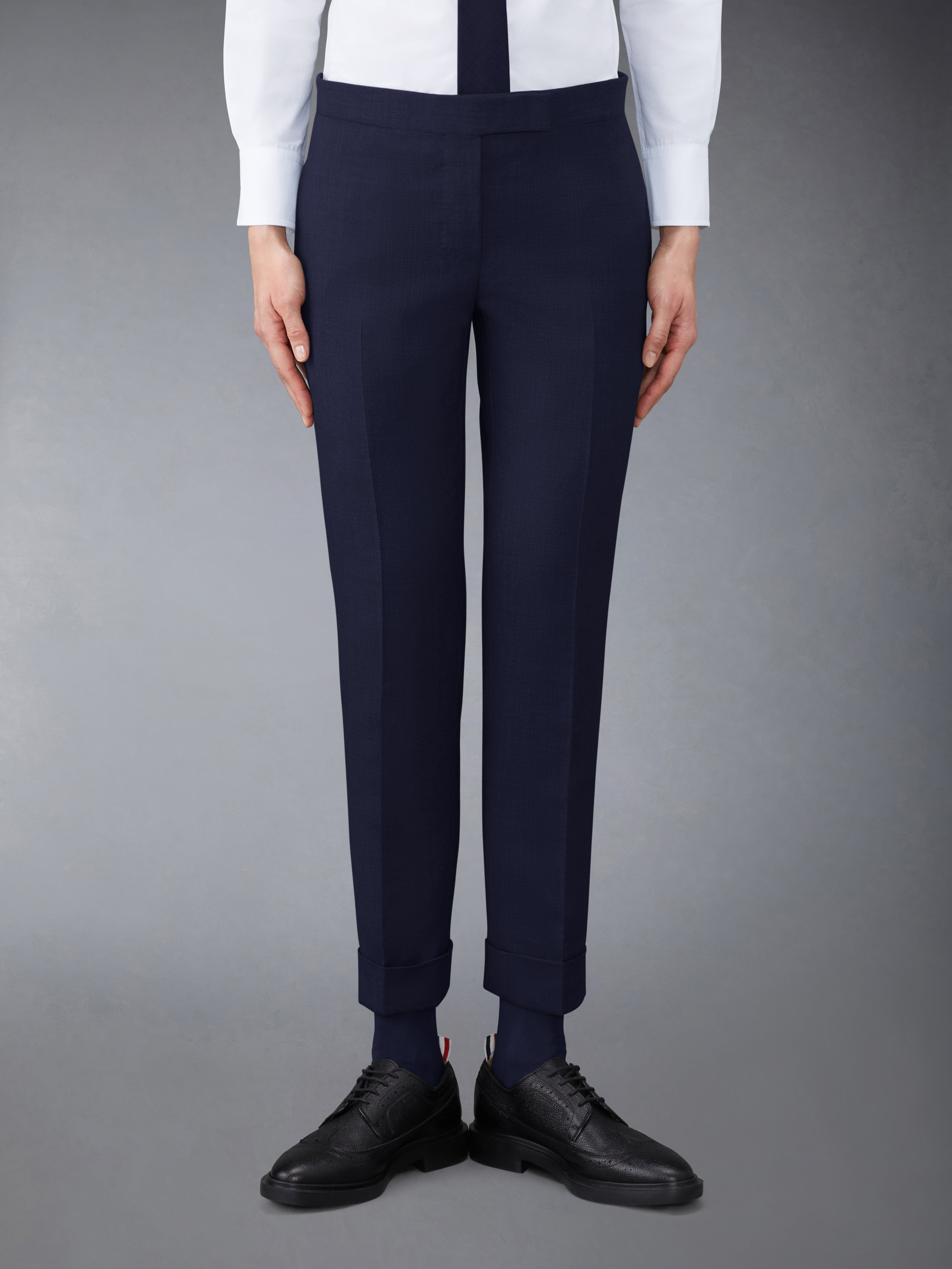 DETAILS & FIT Our Twill Low Rise Skinny Trouser. The classic shortened hem pays homage to Thom Browne’s distinguished tailoring. Tab front closure Adjustable Buttoned side tabs Creased legs Narrow cuffs Slip side pockets Button fastening back welt pockets Signature striped grosgrain loop tab at back waist Model is 5' 10" (178cm), wearing size 40 100% Wool Made in Italy FTC025V-00626-415