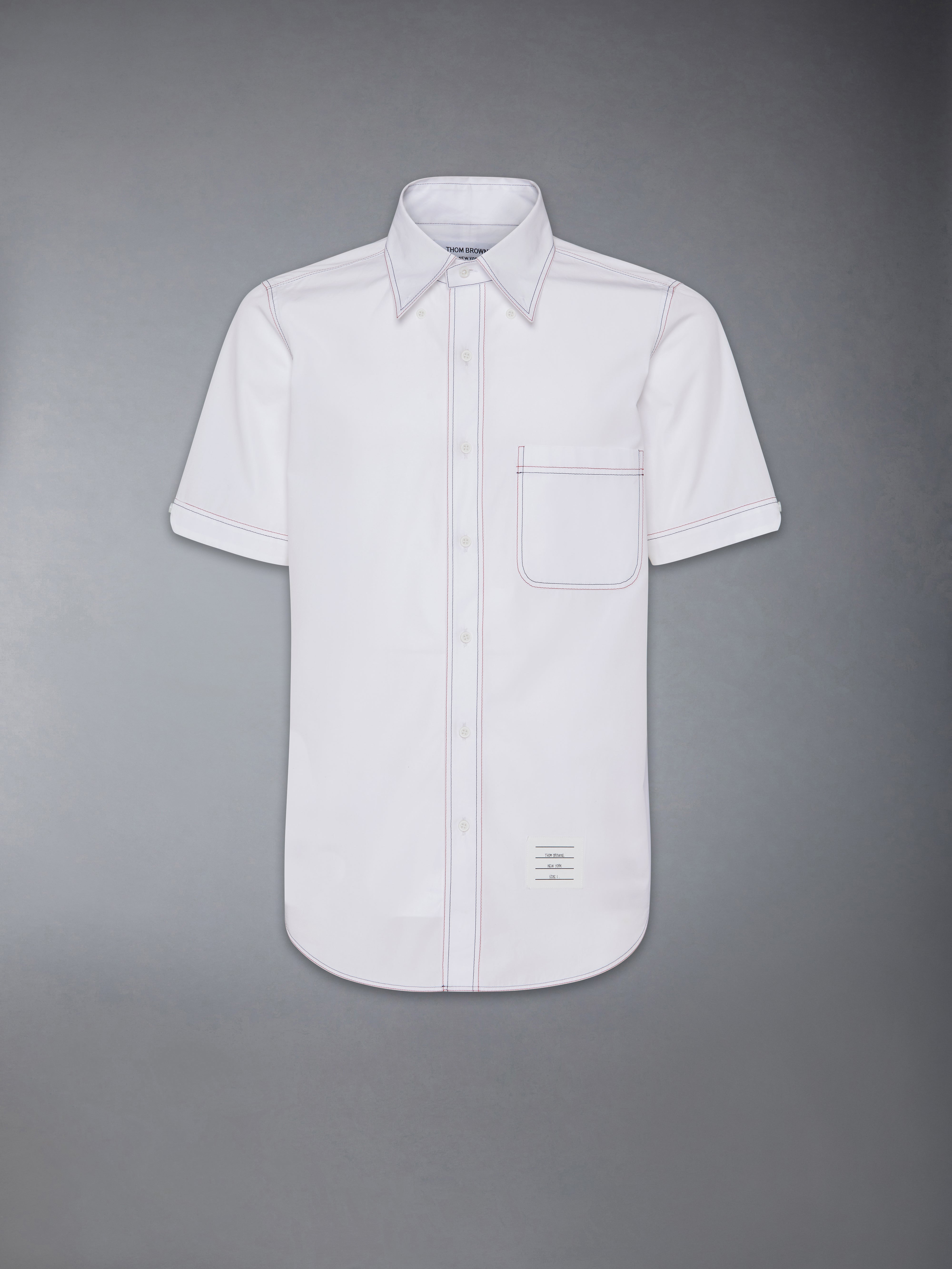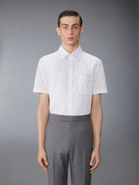 DETAILS & FIT Effortless style meets sophistication with this classic Solid Poplin Twin Needle Contrast Topstitching Shirt, featuring signature Thom Browne emblems throughout. Pair it with one of our signature trousers. Front button closure Front patch pocket Name tag applique above hem Pleated back yoke with locker loop Signature striped grosgrain loop tab Model is 6' 1" (185cm), wearing size 1 100% Cotton Made in ITALY MWS239D-03113-100