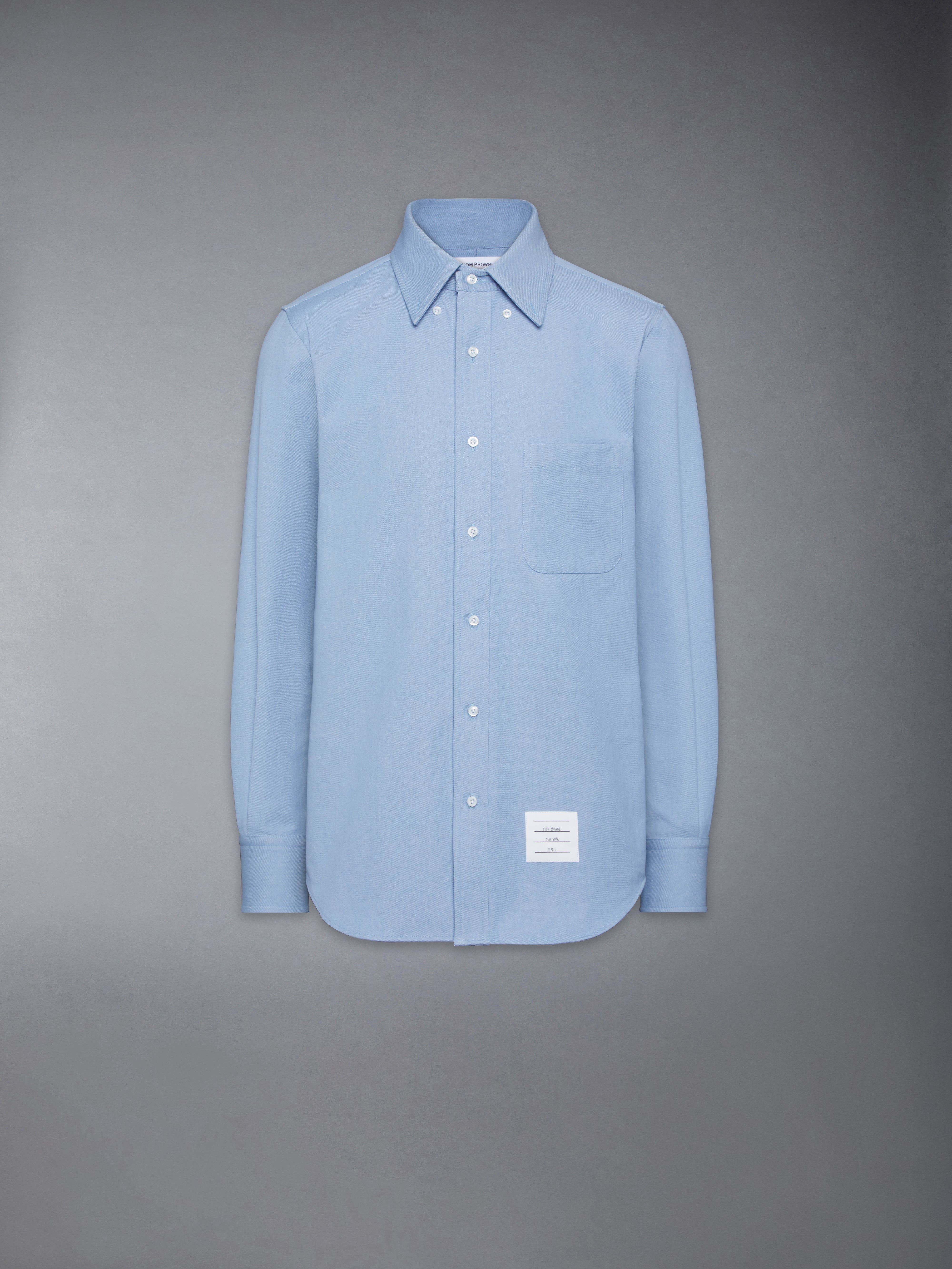 A new expression of Thom Browne is found at the cuff of this fine dress shirt, where our signature grosgrain trim lies beneath for a touch of understated luxury. Pair it with any of our signature dress shorts or trousers. Front button closure Chest patch pocket Name tag applique Pleated back yoke with locker loop Signature striped grosgrain loop tab Model is 6'1" (185cm), wearing size 1 100% Cotton Made in Italy MWL412A-F0942-480 MWL412A-F0942-480