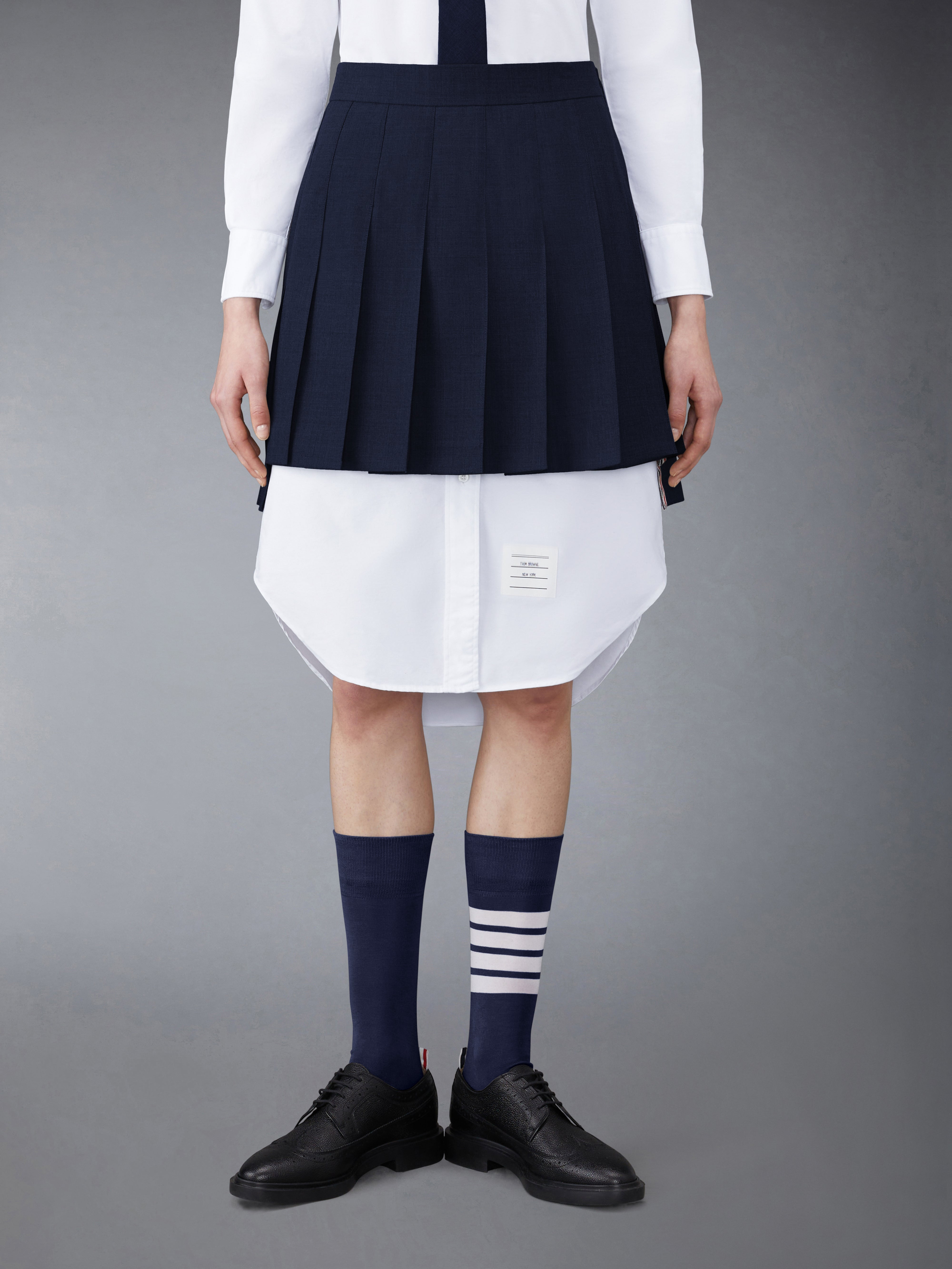 DETAILS & FIT Inspired by East Coast preppy icons but reimagined with inventive proportions and quality craftsmanship, our Super 120's Twill Wool Thigh Length Dropped Back Pleated Skirt is a fresh take on a traditional silhouette. Pair with our leather brogue heels. Side zip closure Adjustable button backstrap Dropped back hem with signature grosgrain trim Signature striped grosgrain loop tab at back waist Model is 5' 10" (178cm), wearing size 40 100% Wool Lining: 100% Cupro Made in Italy FGC402V-00626-415