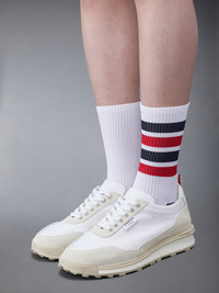 DETAILS & FIT Leisurewear made artful. These crisp trainers were inspired by Thom's passion for sport. Lace up closure Rubber sole Leather lining Signature striped grosgrain loop tabs Combo1: 100% Calf Leather Upper: 73% Polyester, 27% Polyamide Sole: 100% Rubber Lining: 100% Calf Leather Made in Italy MFD271B-F0488-107