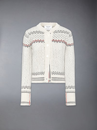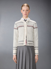 Crafted in a traditional Fair Isle knit, this cozy wool and mohair cardigan is designed to keep you warm all season long. A blend of heritage charm and modern craftsmanship, it features our signature grosgrain trim along the placket. Pair it effortlessly with our Twill Midi Pleated Skirt. Front button closure Buttoned cuffs with signature striped grosgrain trim Buttoned side vents with signature striped grosgrain trim Signature striped grosgrain loop tab Model is 5'10" (178 cm), wearing size 40 70% Wool, 30% Mohair Made in Italy FKC677A-Y1506-100