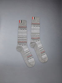 Featuring a traditional Fair Isle pattern, these socks are crafted from fine virgin wool, offering both warmth and durability. Signature grosgrain loop tabs add a subtle touch of Thom Browne sophistication. Pair them with our Calf Suede RWB-Stripe Chelsea Boots. Signature striped grosgrain loop tabs 68% Virgin Wool, 31% Polyamide, 1% Elastane Made in Italy MAS208A-Y1020-055