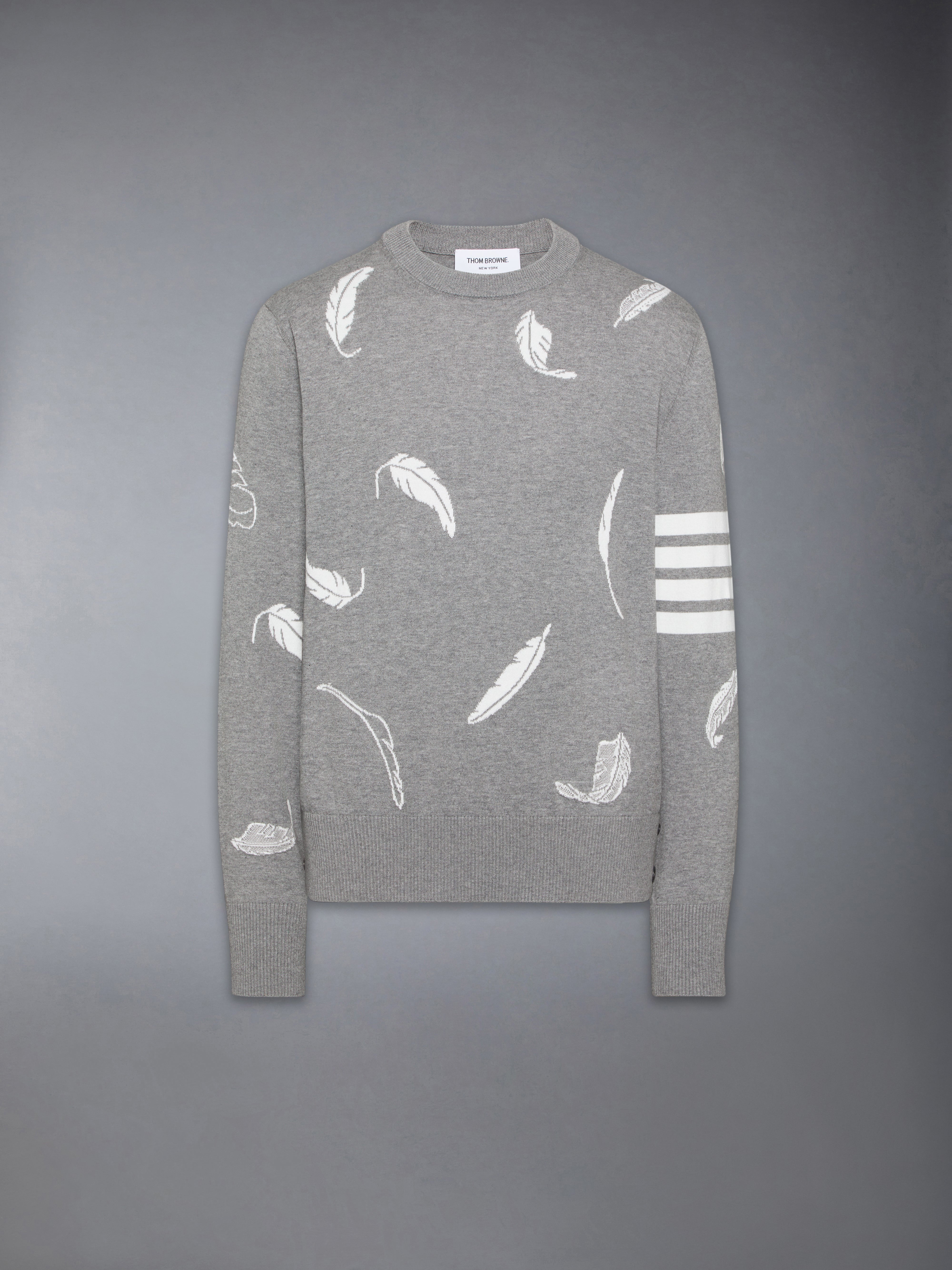 Adorned with woven feathers throughout, this sweater is the perfect piece for transitional dressing. Each feather symbolizes bird migration patterns, seasonal shifts, and new beginnings. Our signature 4-bar detailing nods to midcentury collegiate and sports uniforms, representing discipline, achievement, and tenacity—values central to Thom Browne. 4-bar detailing Buttoned cuffs with signature striped grosgrain trim Buttoned side vents with signature striped grosgrain trim Signature striped grosgrain loop tab Model is 6'1" (185cm), wearing size 1 100% Cotton Made in Italy MKA556A-Y3039-055 MKA556A-Y3039-055
