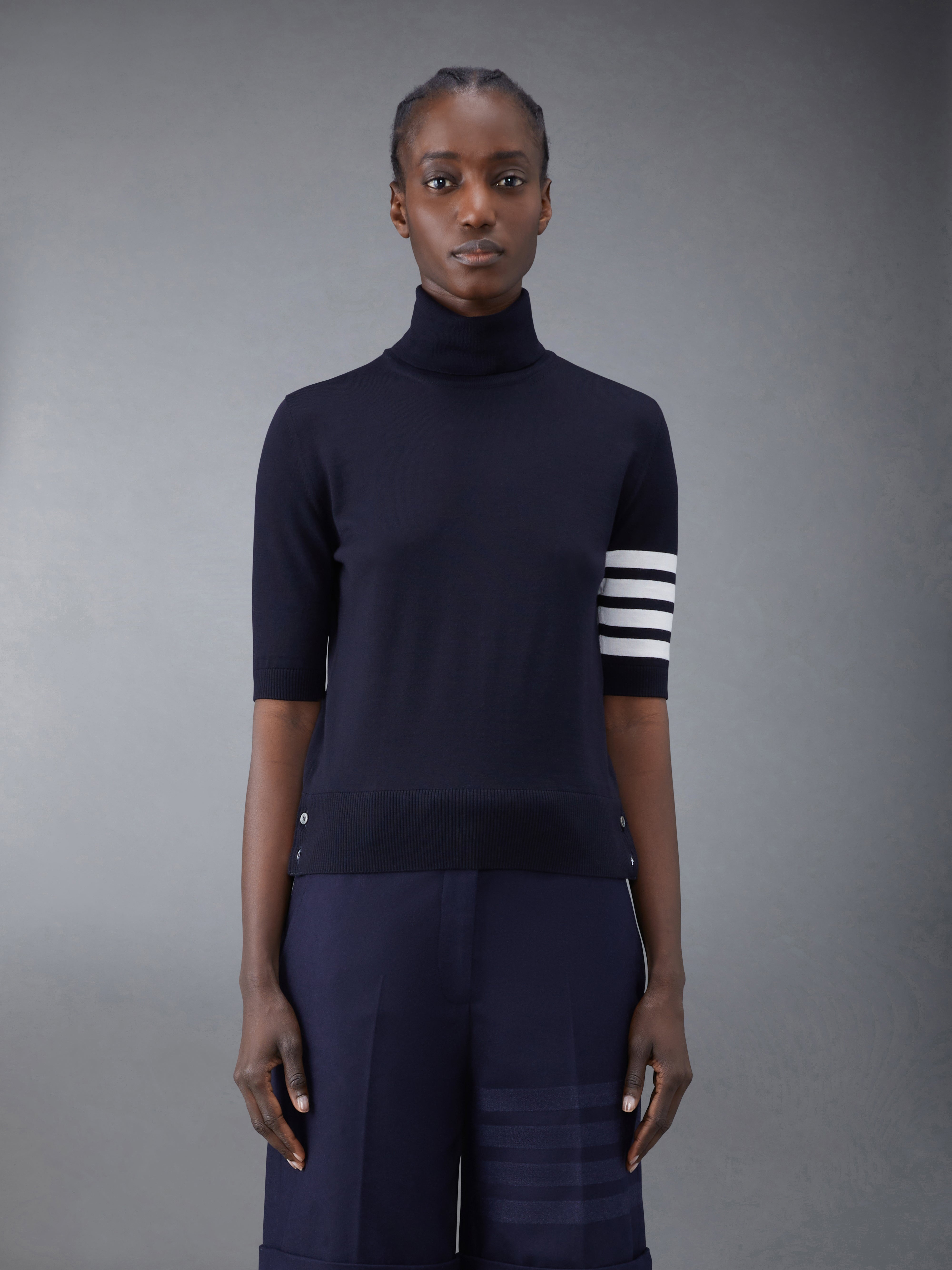 Relaxed short sleeve turtleneck in fine navy Merino wool with 4-bar stripe detail at left sleeve in white. Buttoned side vents with signature striped grosgrain trim. Signature striped grosgrain loop tab at back of neck. Model is 5'10" (178 cm), wearing size 40 99% Virgin Wool, 1% Polyamide Made in Italy FKA434AY1014415 FKA434A-Y1014-415