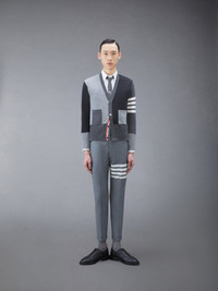 DETAILS & FIT Our Fun-Mix Cashmere 4-Bar V-neck Cardigan. Shades of rich cashmere are woven together in patchwork form amidst two signature Thom Browne emblems — 4-Bar stripes and grosgrain ribbon. V-neckline Front button closure with striped grosgrain placket 4-bar stripe detail at left sleeve Buttoned side vents and cuffs with signature striped grosgrain trim Signature striped grosgrain loop tab at back of neck Model is 6' 1" (185cm), wearing size 1 100% Cashmere Made in Great Britain MKC001F-00011-982