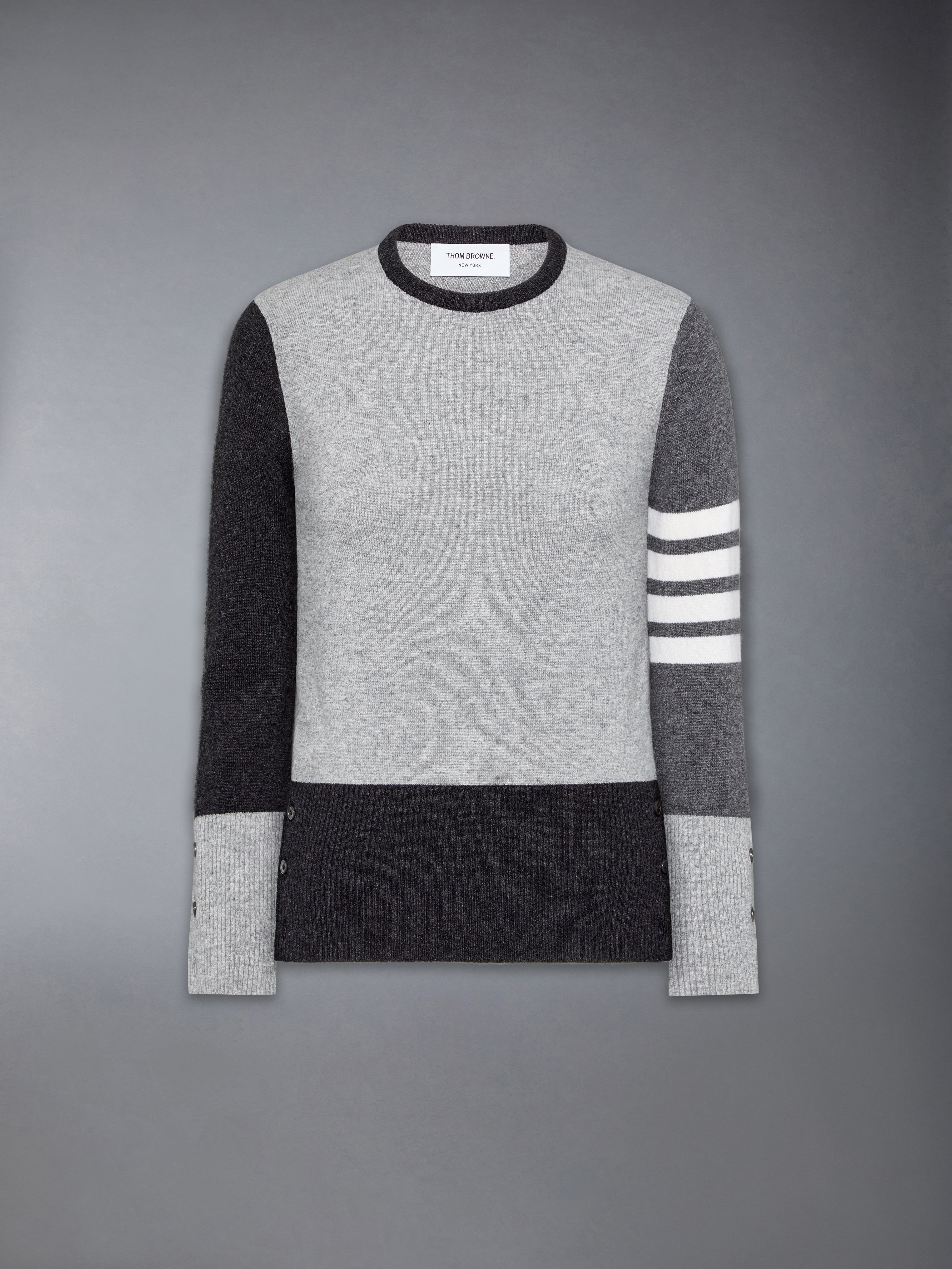 A simple pullover that exudes sophistication. Shades of luxurious cashmere fabric are woven together in patchwork form amidst signature Thom Browne emblems. Our iconic 4-bar detailing pays homage to mid-century collegiate and sports uniforms, embodying discipline, achievement, and tenacity—values at the heart of Thom Browne. Complete the look with our Twill Midi Pleated Skirt. 4-bar detailing Buttoned cuffs with signature striped grosgrain trim Buttoned side vents with signature striped grosgrain trim Signature striped grosgrain loop tab Model is 5'10" (178 cm), wearing size 40 100% Cashmere Made in United Kingdom FKA001F-00011-982