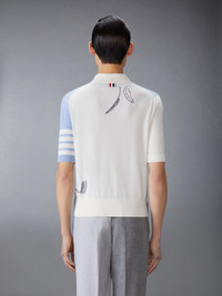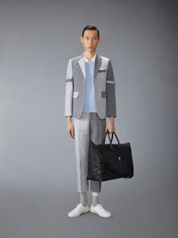 Delicate woven feathers cascade down this garment, symbolizing bird migration and the changing seasons. Our signature 4-bar detailing pays homage to midcentury collegiate and sports uniforms, embodying discipline, achievement, and tenacity—values at the heart of Thom Browne. Partial front button closure 4-bar detailing Buttoned side vents with signature striped grosgrain trim Signature striped grosgrain loop tab Model is 6'1" (185cm), wearing size 1 100% Cotton Made in Italy MKP145F-Y3039-482 MKP145F-Y3039-482