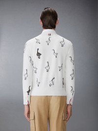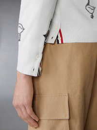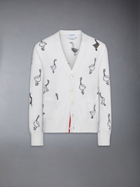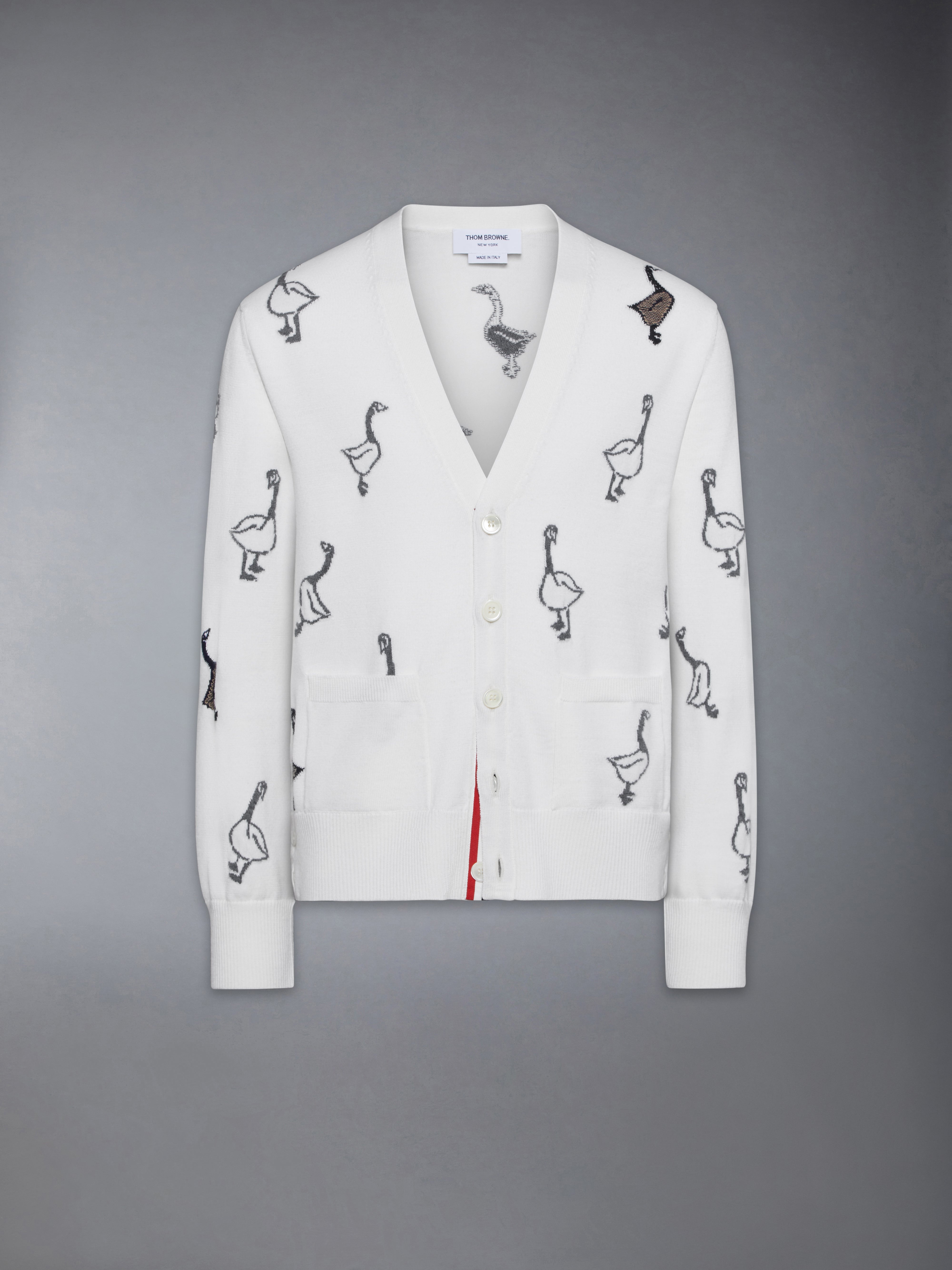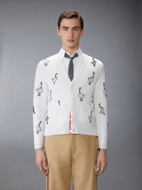 Woven geese adorn this cardigan, symbolizing migration, change, unity, and the courage to embrace what’s next. Equipped with two small pockets, this piece blends symbolism with practicality for a functional yet meaningful addition to your wardrobe. Pair it with our Washed Cotton Utility Cargo Trousers. Front button closure with striped grosgrain placket 2 Front slip pockets Buttoned cuffs with signature striped grosgrain trim Buttoned side vents with signature striped grosgrain trim Signature striped grosgrain loop tab Model is 6'1" (185cm), wearing size 1 100% Cotton Made in Italy MKC599A-Y1051-100