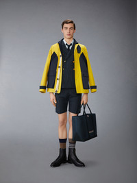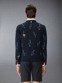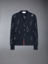 Woven geese adorn this cardigan, symbolizing migration, change, unity, and the courage to embrace what’s next. Equipped with two small pockets, this piece blends symbolism with practicality for a functional yet meaningful addition to your wardrobe. Pair it with our Washed Cotton Utility Cargo Trousers. Front button closure with striped grosgrain placket 2 Front slip pockets Buttoned cuffs with signature striped grosgrain trim Buttoned side vents with signature striped grosgrain trim Signature striped grosgrain loop tab Model is 6'1" (185cm), wearing size 1 100% Cotton Made in Italy MKC599A-Y1051-415